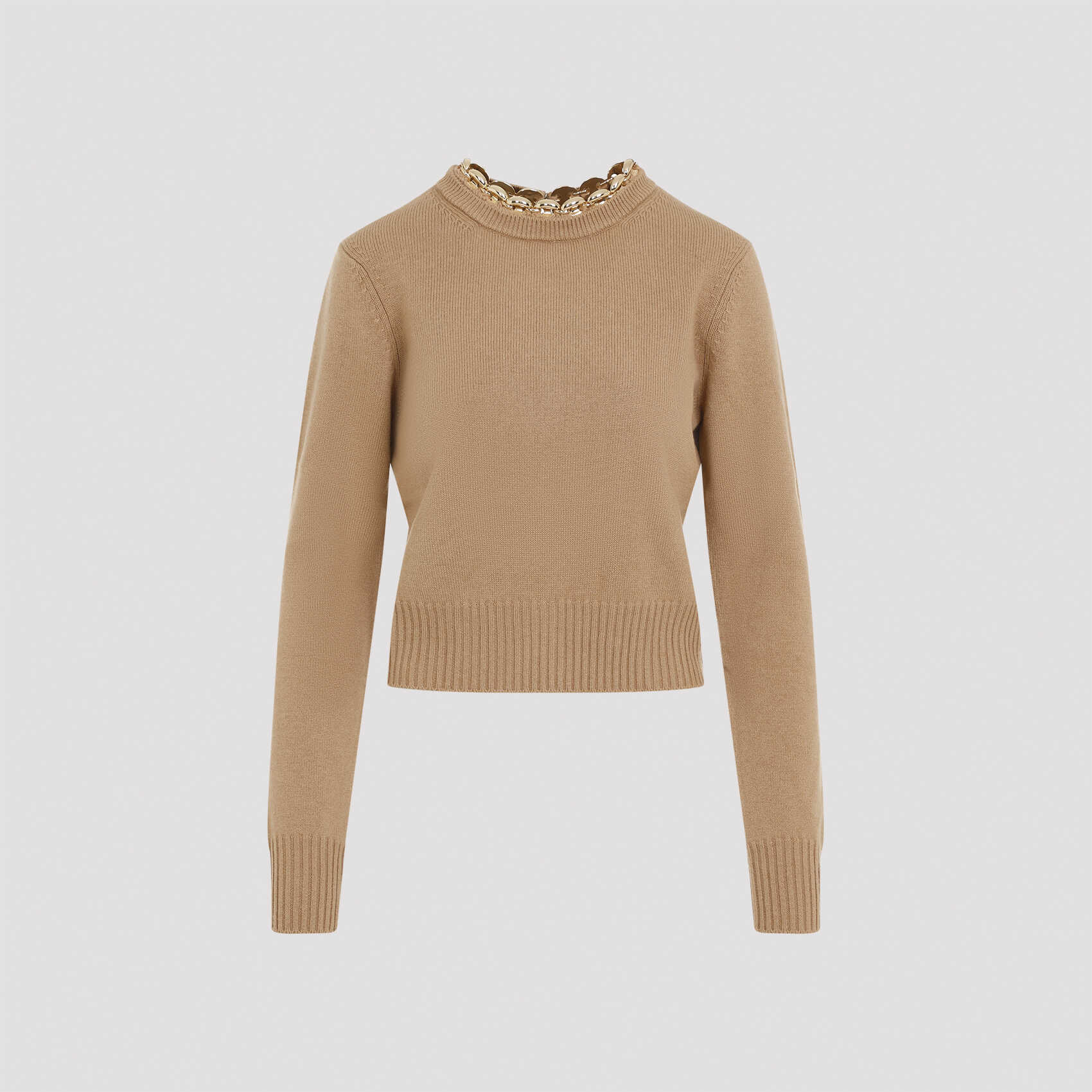 Elevate your wardrobe with this luxurious Rabanne pullover in camel brown. Made from a blend of merino wool and cashmere, it features a chic round neck with a gold-tone metallic chain detail. The back buttoned fastening adds a unique touch, while the long sleeves and ribbed cuffs ensure a comfortable fit. Perfect for adding a touch of sophistication to any outfit.
