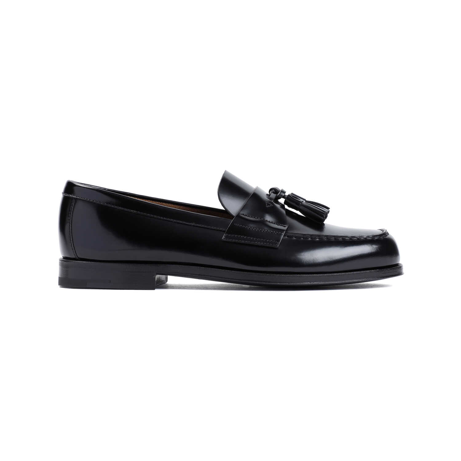 Step up your style game with these sleek PRADA black brushed calf leather loafers. Made from high-quality brushed calf leather, these loafers feature a round toe, tonal stitching, and a top leather strap with a tonal tassel. The slip-on style and tonal sole add a touch of sophistication to any outfit. Elevate your look with these luxurious PRADA loafers.