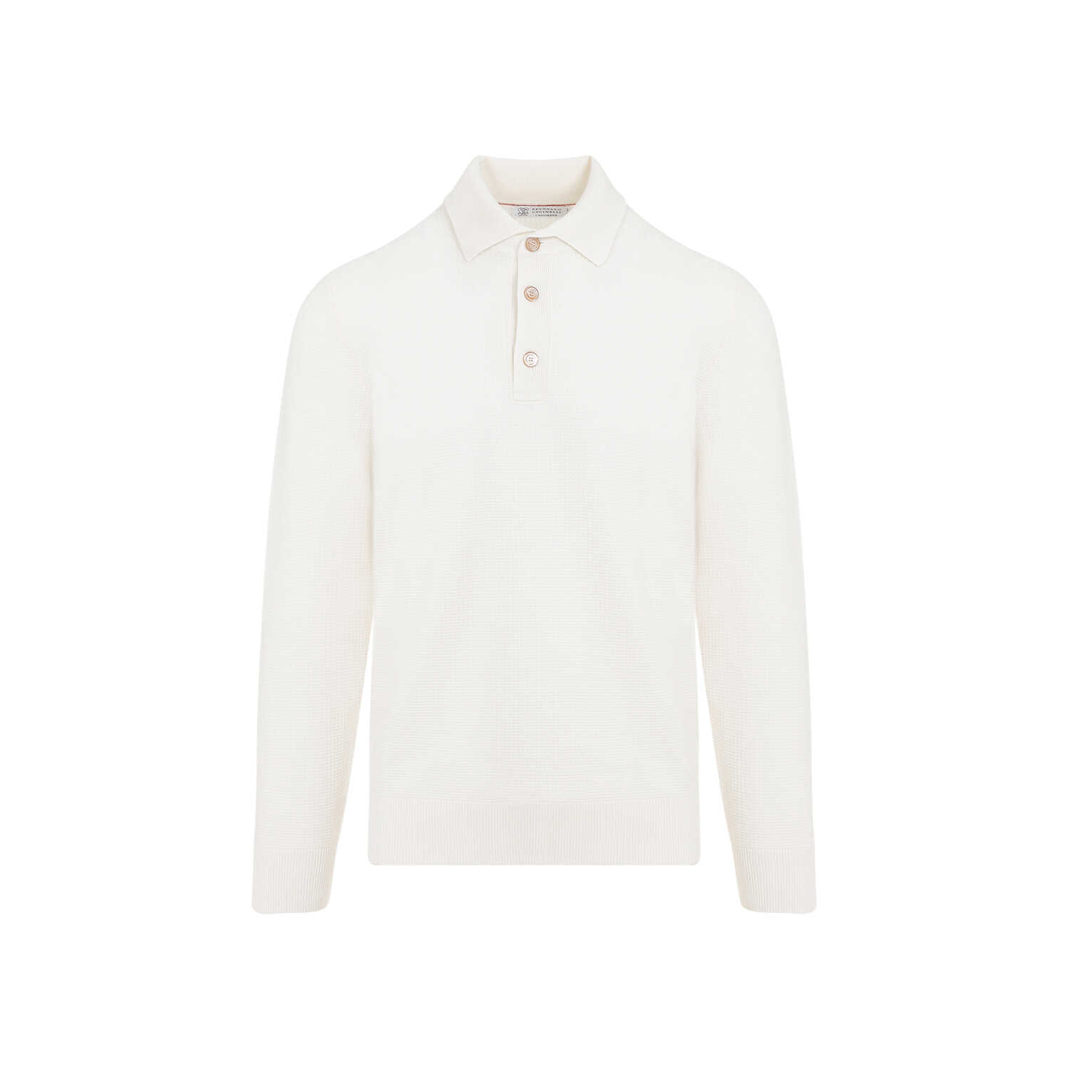 Elevate your style with this luxurious Brunello Cucinelli Panama White Cashmere Knit Polo. Crafted from 100% pure cashmere, it features a classic polo collar, ribbed design, and long sleeves for a sophisticated look. Perfect for adding a touch of elegance to your wardrobe.