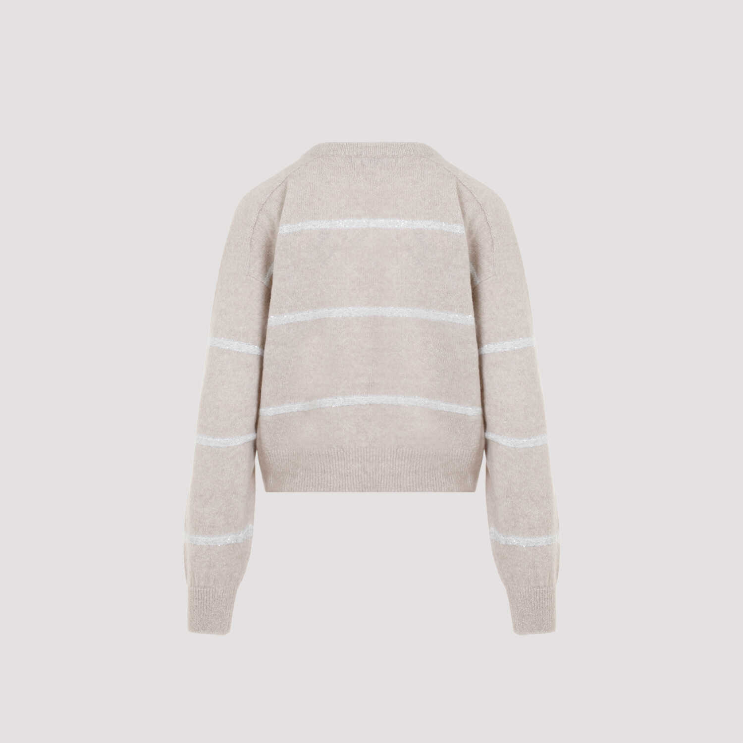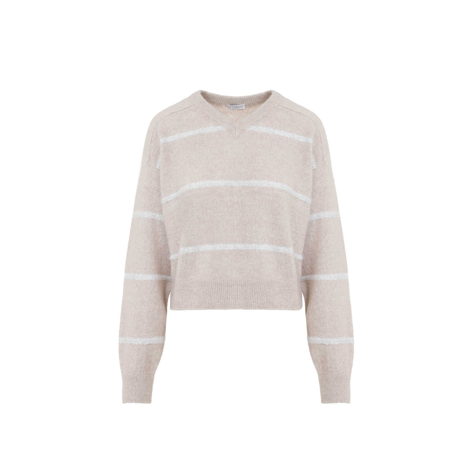 Elevate your style with this luxurious Brunello Cucinelli sweater in a chic nude & neutrals color. Crafted from a blend of alpaca, cotton, polyamide, and wool, featuring a stunning paillettes stripe pattern, v-neckline, and cropped silhouette. Perfect for adding a touch of sophistication to your wardrobe. Shop now and stand out in style!