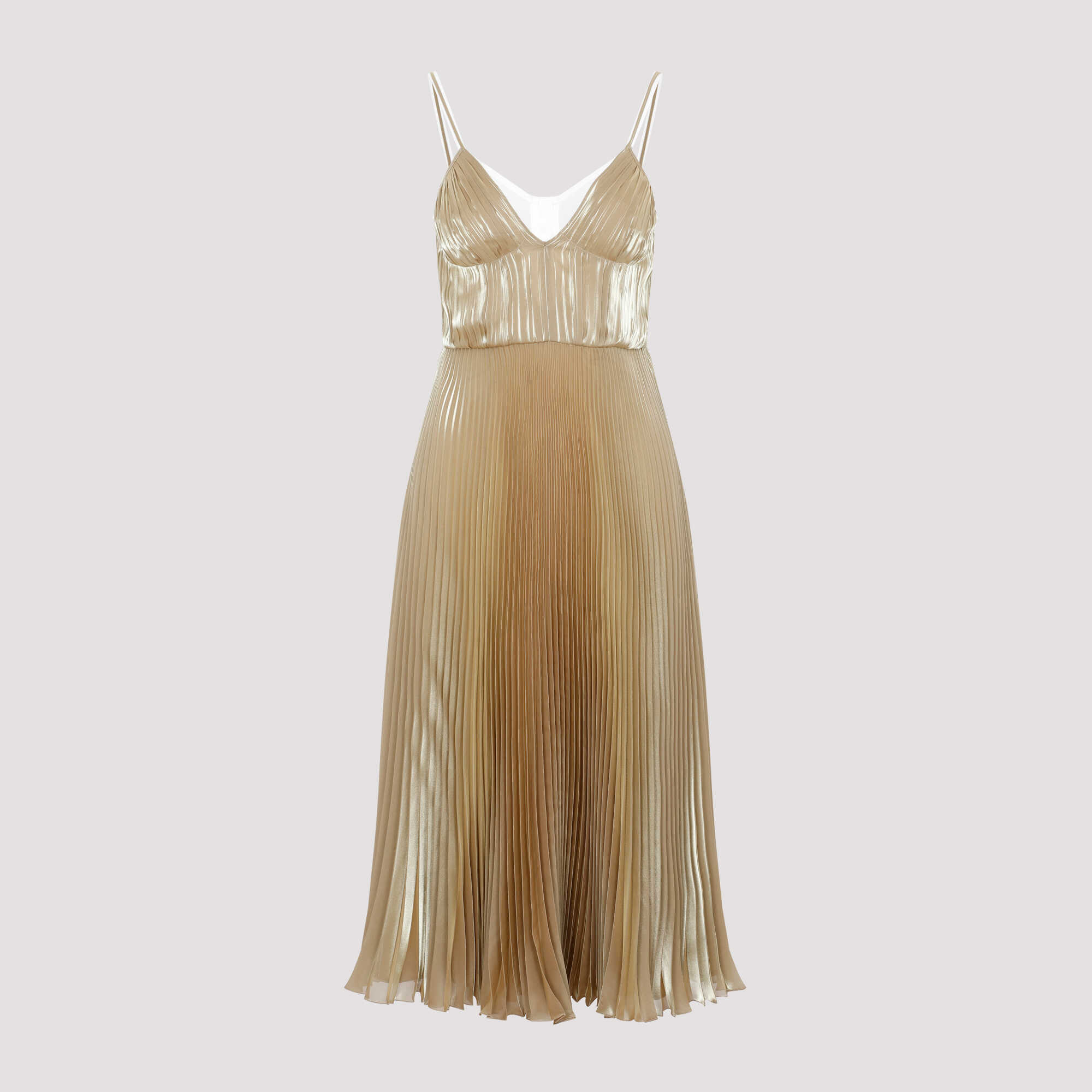 Prada Metallic Yellow Dress. Crafted in pure mustard tech fabric with a metallic finish. Deep V-neck, spaghetti straps, contrasting internal but visible bra with adjustable straps, stitching under the cups, pleated design, invisible back zip fastening, flowy skirt, straight hem.
