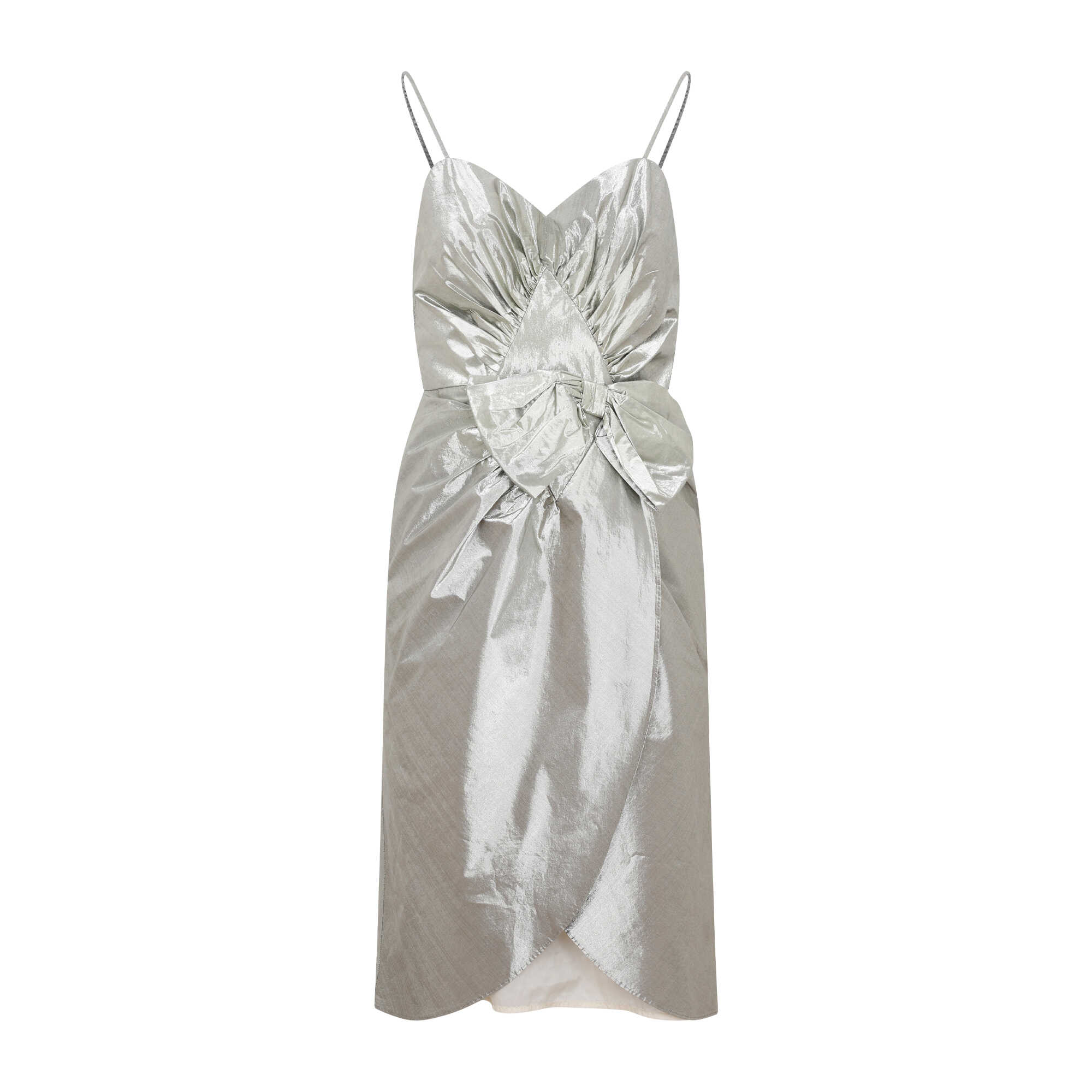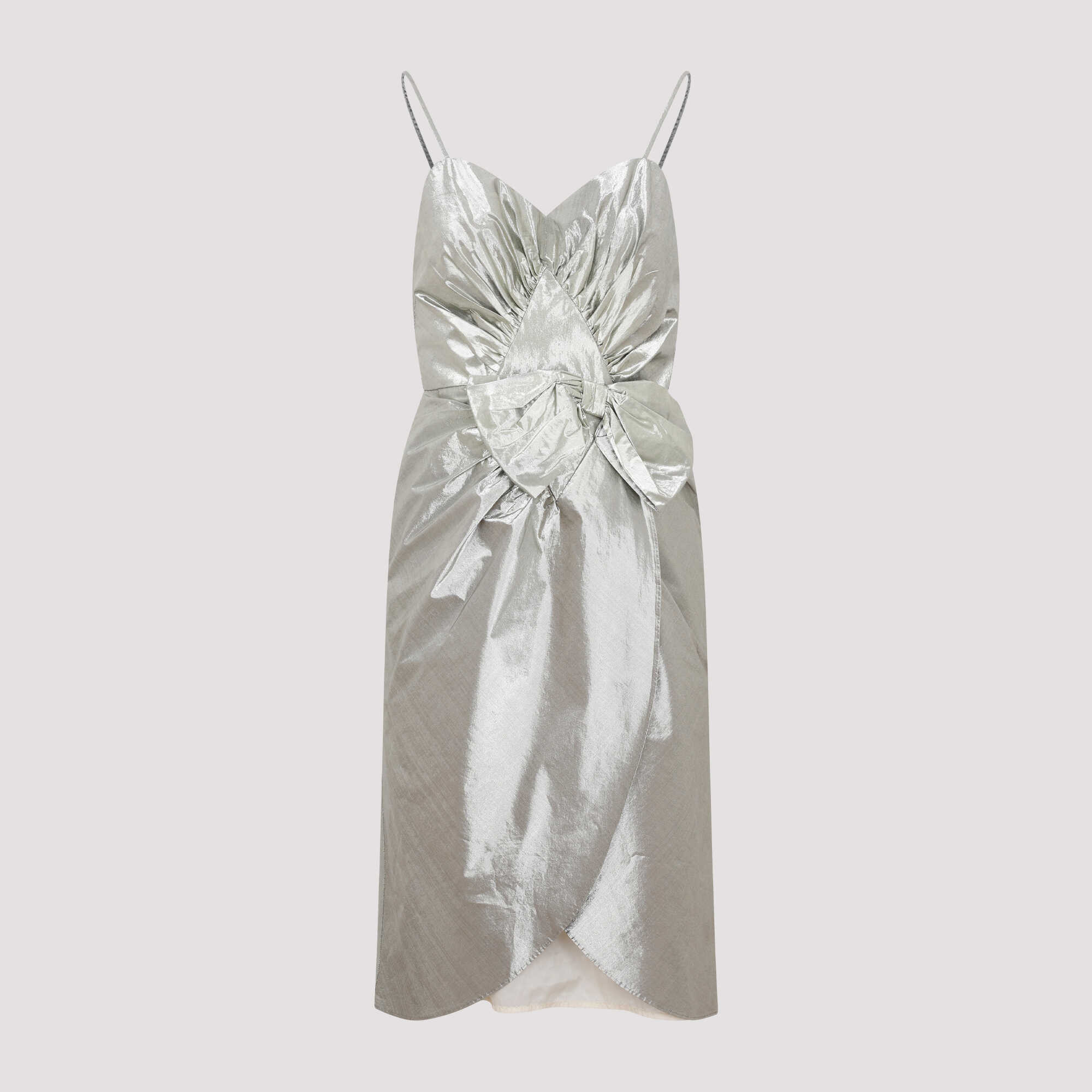 Maison Margiela Silver Midi Dress. Crafted in a silver-colored cotton and tech fabric blend with a metallic finish. Sweetheart neckline, spaghetti straps, sleeveless, draped detail on the front, maxi bow embellishment, invisible back zip fastening, wrap skirt, midi length, asymmetrical hem, lined.