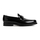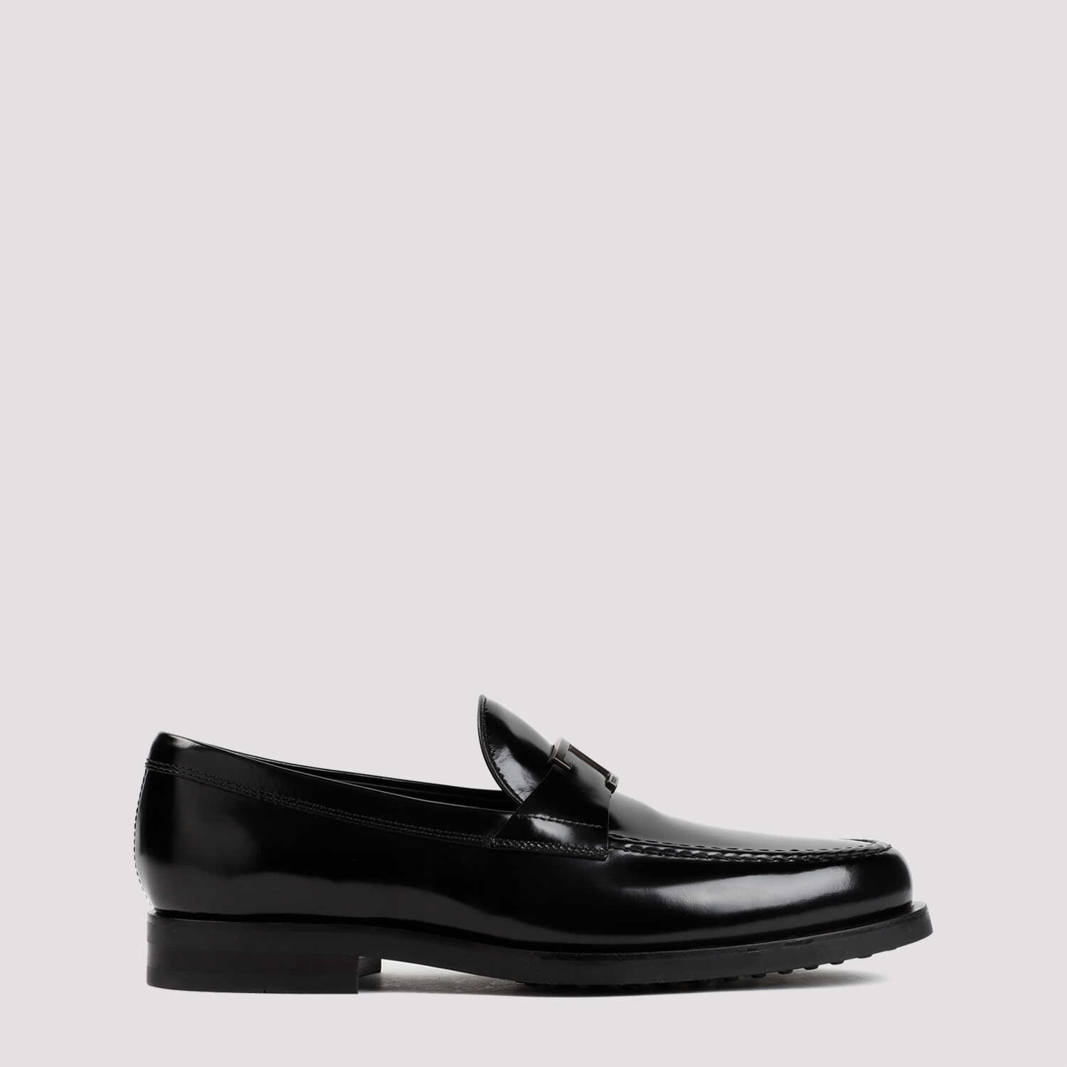 Tod`s Black Brushed Leather Loafers. Black brushed leather vamp, shiny effect, rounded toeline, strap on the upper with antinque silver-tone T-shaped metal detail, reinforced heel, leather branded insole, black rubber outsole.