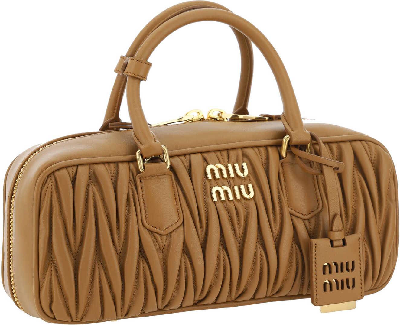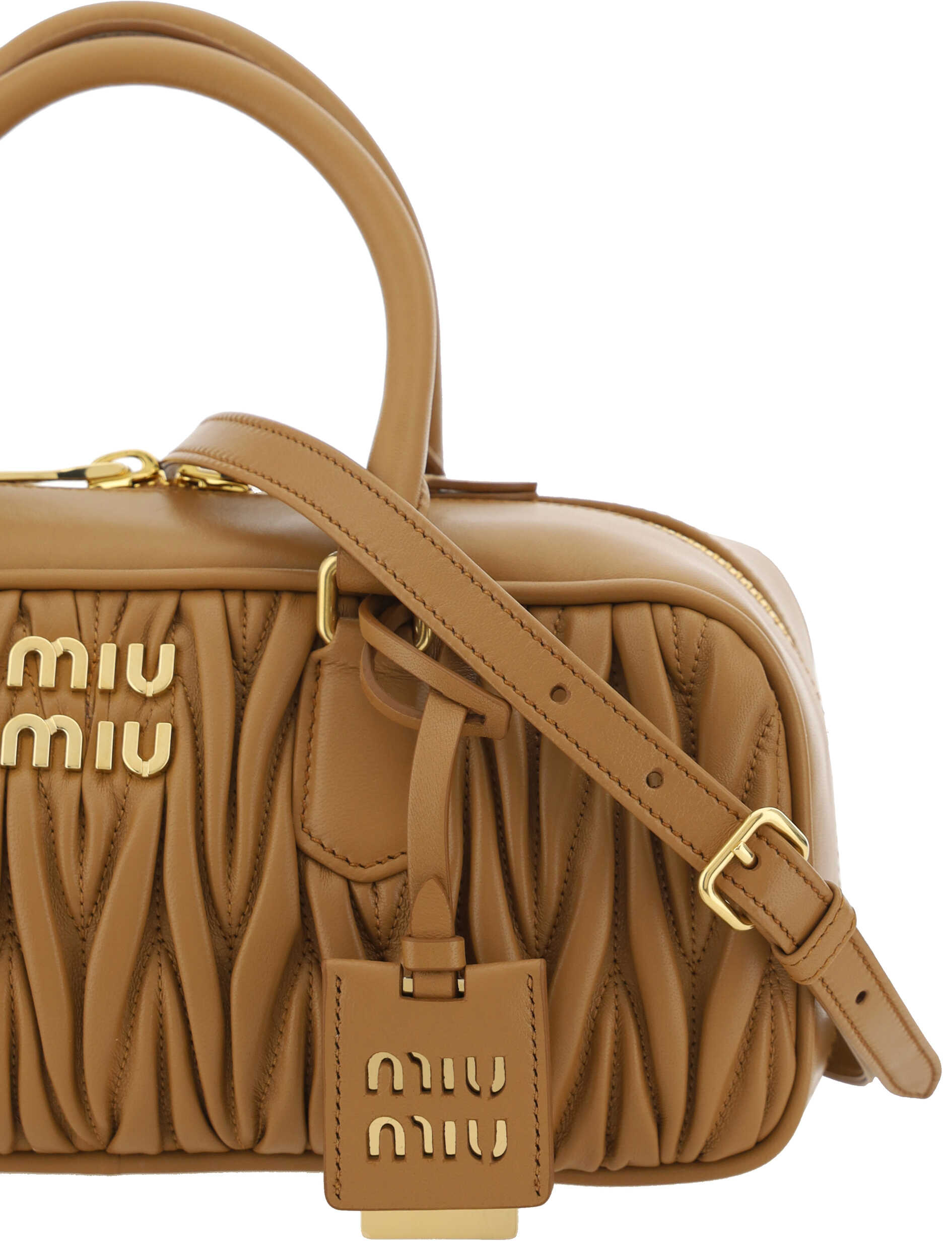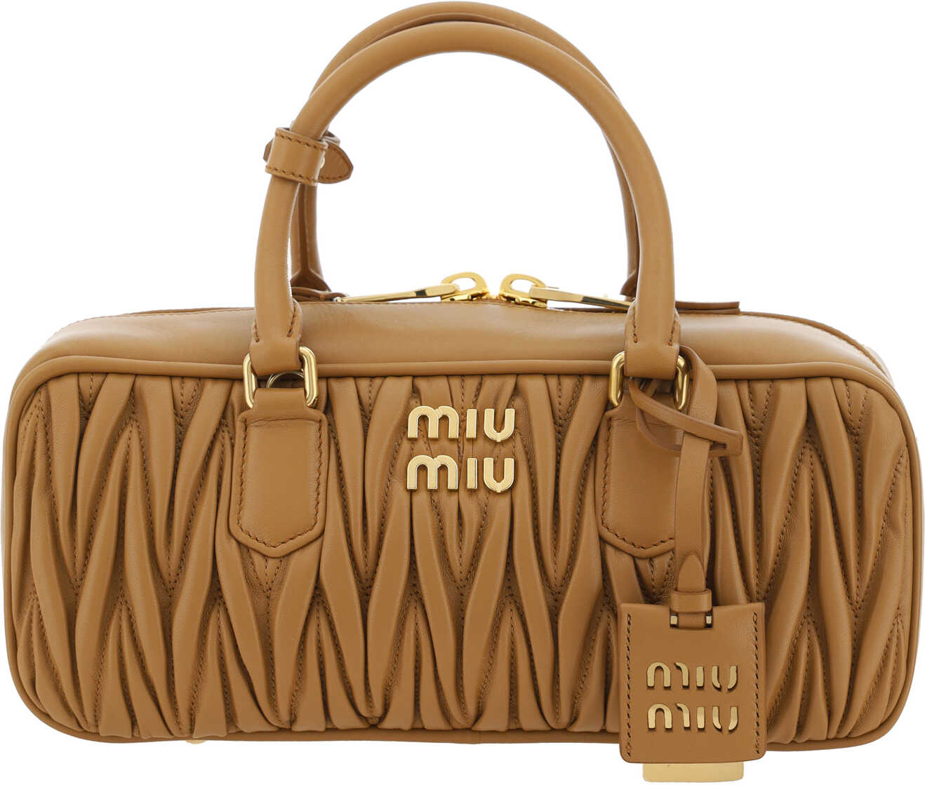 Lambskin Handbag by Miu Miu, iconic matelassé design, iconic brand monogram applied in contrasting embossed on the front, top zipper closure, main compartment, double stiff handles at the top, removable and adjustable flat leather shoulder strap, key ring attached to the base of the handle, single interior compartment.