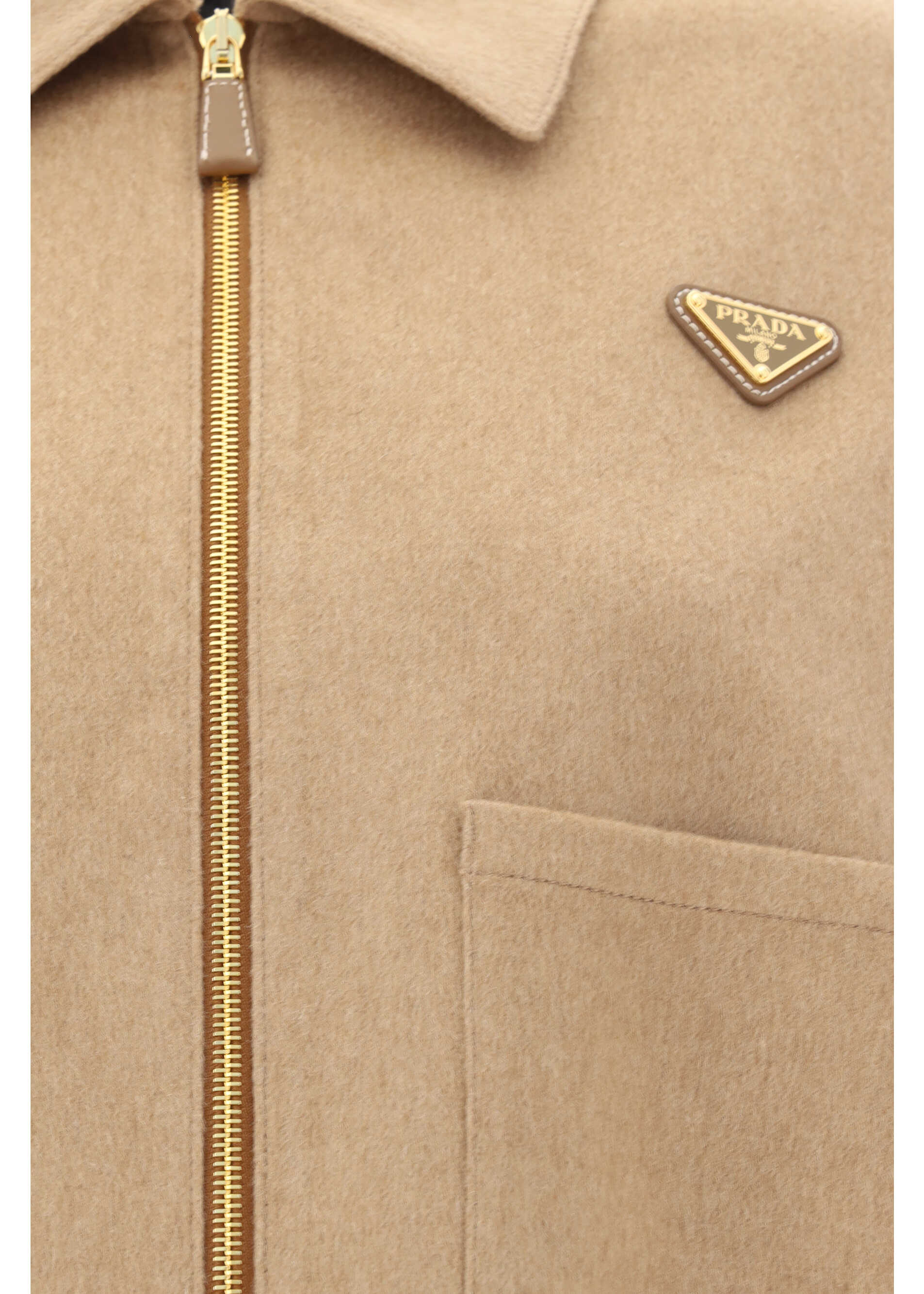 Jacket by Prada, classic collar, exposed front zipper closure, two patch pockets on front panel, three-dimensional enameled plaque with iconic brand signature applique on front, crop pattern, regular fit.
