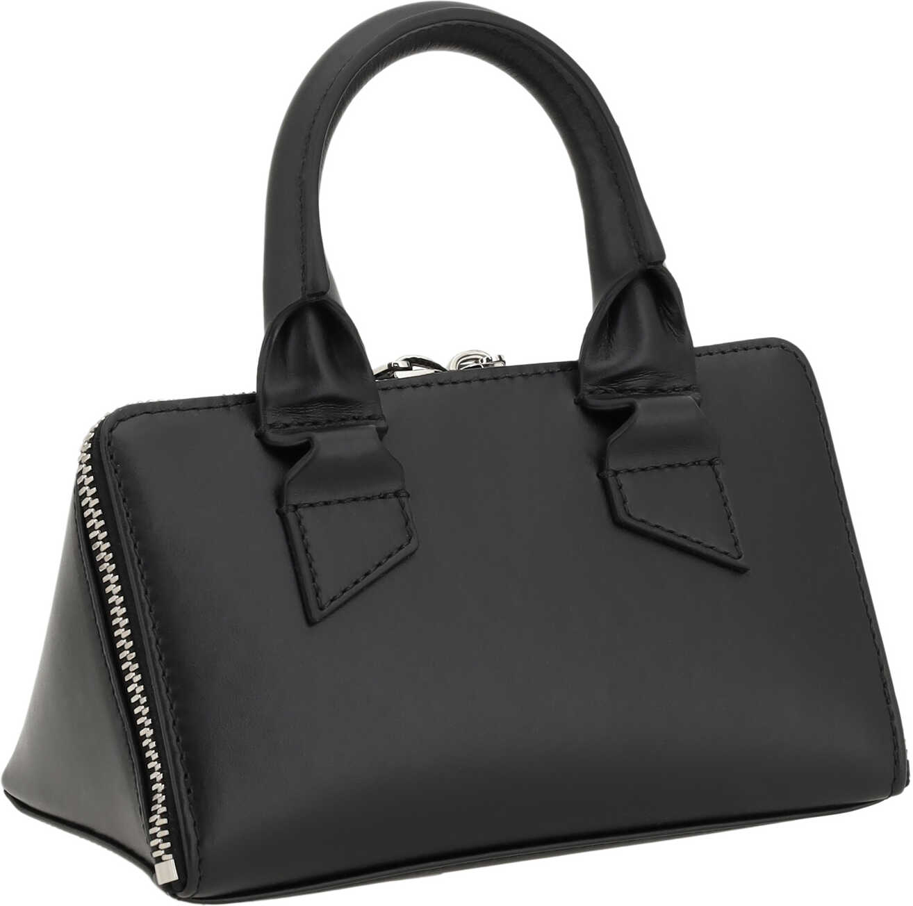 Leather Friday Handbag by The Attico, geometric design, top turn-around closure via double-slider zipper, round stiff handle, metal feet at the base of the bag in the shape of the brand's iconic logo, single interior compartment, iconic brand signature press-stamped on the front.