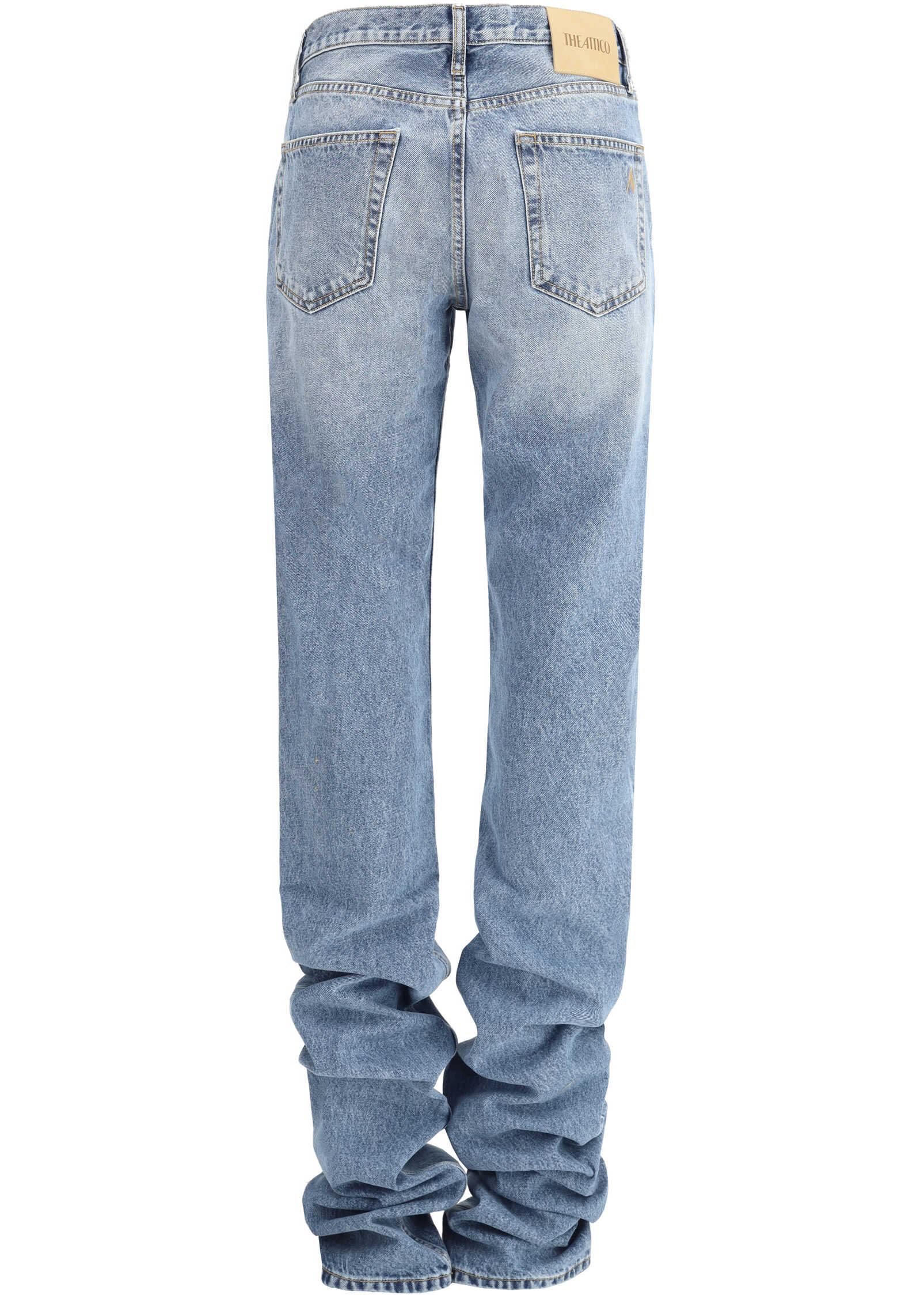 Cotton Jeans by The Attico, five-pocket style, very long leg detail and gathered at the bottom, front button closure, belt loops for waistband, iconic branded signature leather pressure-printed patch applied at the back.