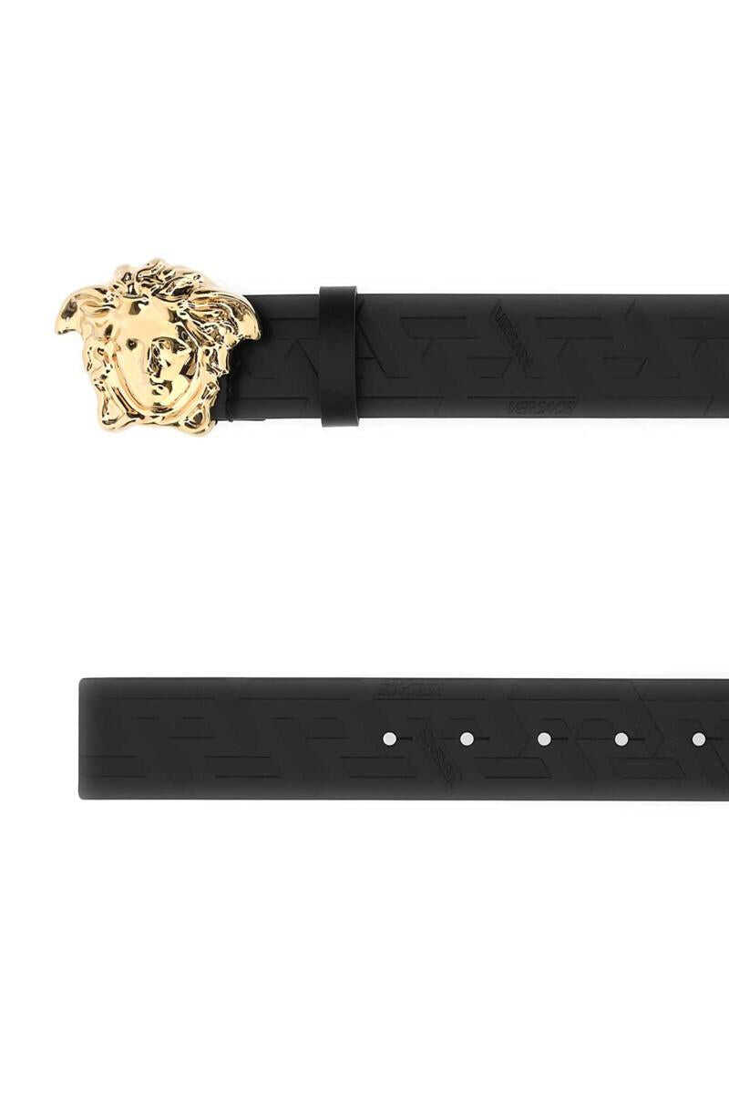 Black leather La Medusa Greca belt from Versace featuring gold tone metal Meusa buckle, adjustable closure and logo detail.