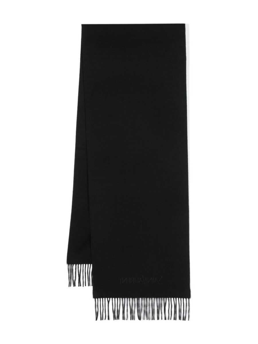 black cashmere embroidered logo to the front rectangle shape fringed edge