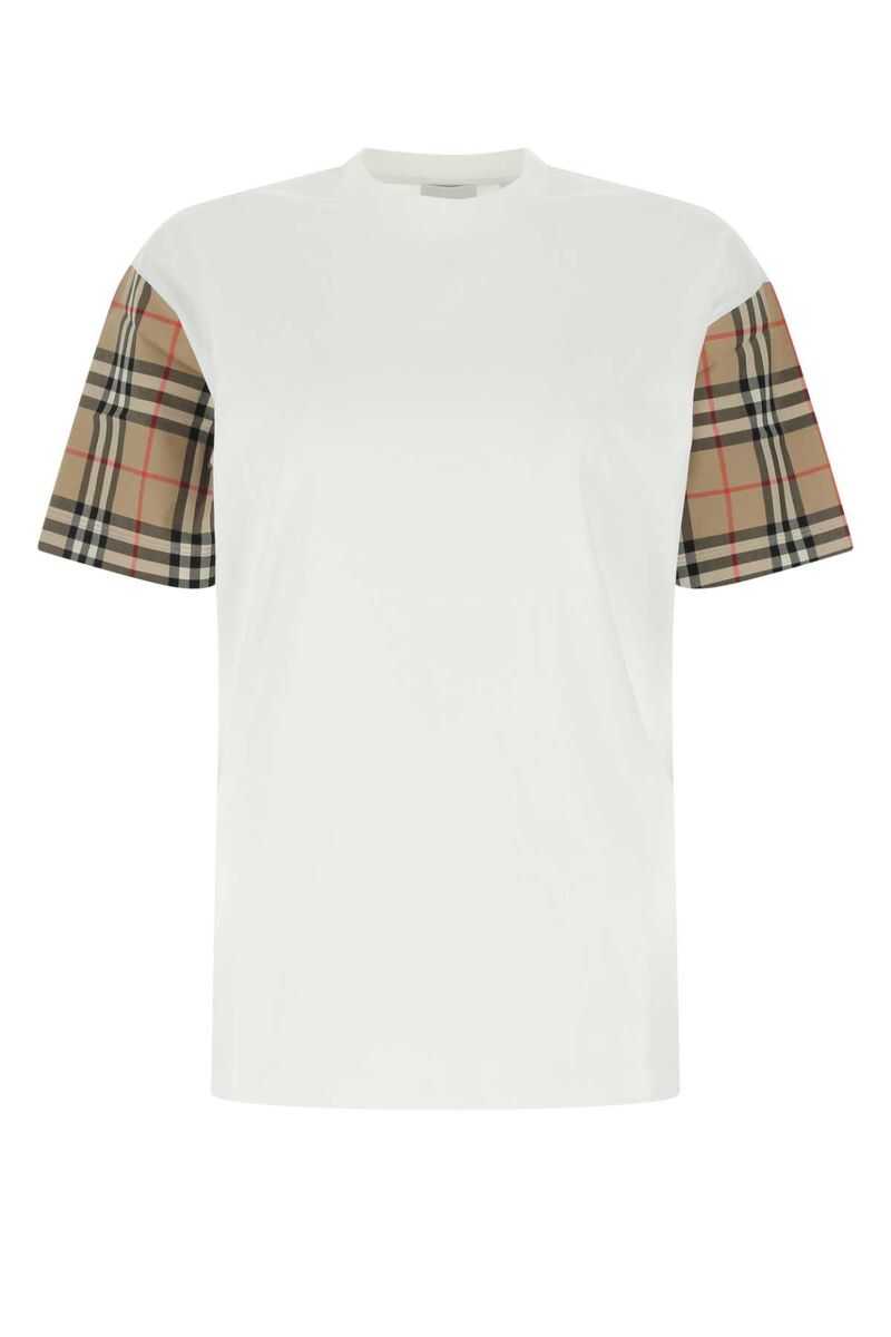 White/archive beige cotton Vintage Check-sleeve T-shirt from BURBERRY featuring Vintage Check pattern, round neck, drop shoulder, short sleeves and straight hem. Conscious: This item is made from at least 50% organic materials.