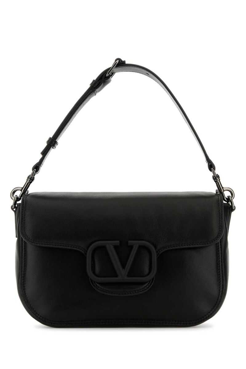Valentino Garavani’s Noir black nappa leather shoulder bag featuring an adjustable and detachable top handle, adjustable and detachable fabric shoulder strap, tone-on-tone rubberized metal VLogo Signature buckle, concealed magnetic fastening, back flat pocket, internal zip pocket and silver-tone metal hardware.