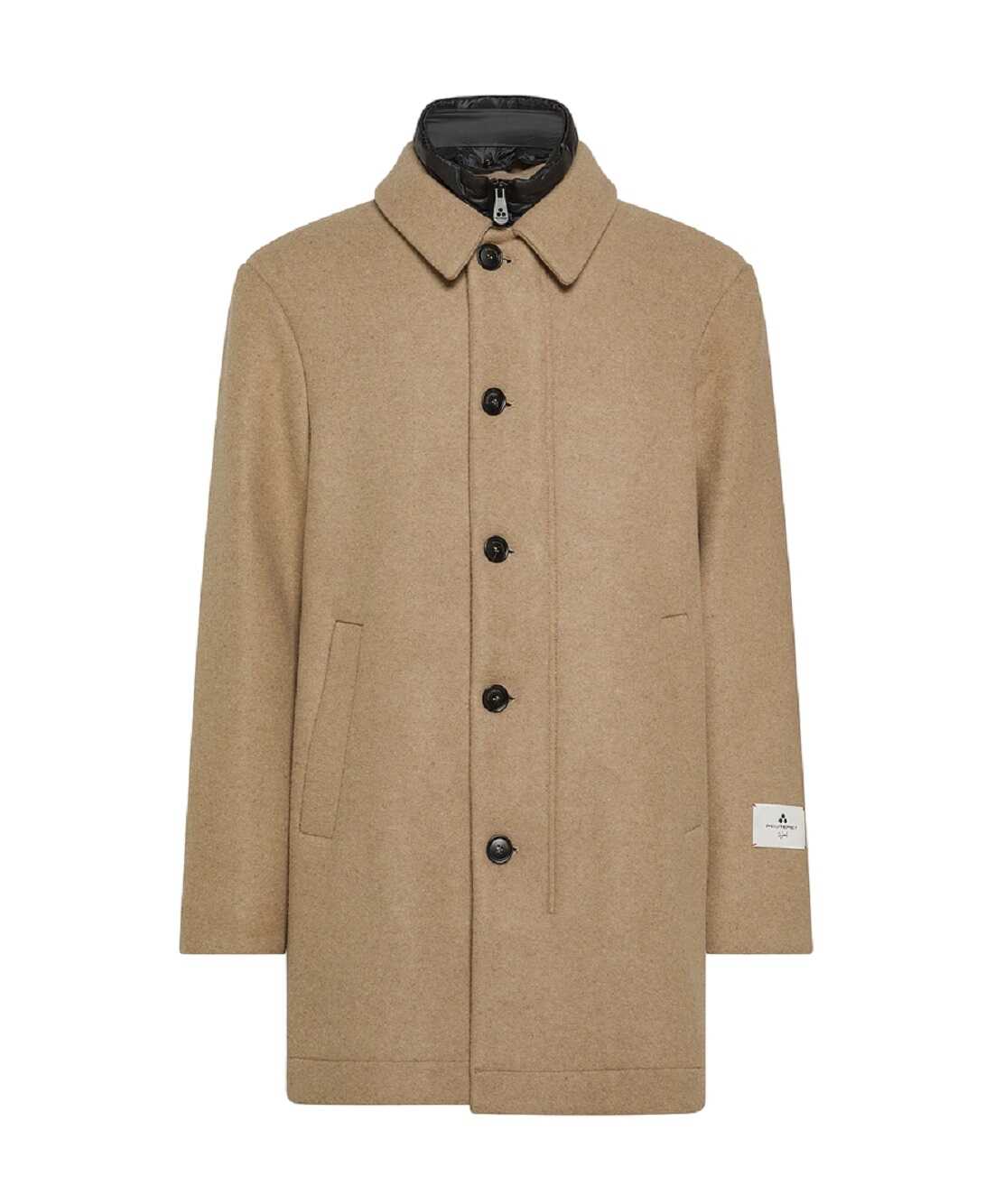 Coat from the brand new Peuterey Wool line, where Made in Italy wool acquires a sportier look thanks to the pairing of a jersey flannel with a technical nylon sweatshirt, creating a scuba wool look. The result is a light, warm and technical garment. Italian collar, detachable internal Primaloft bib with single-slider zip, visible buttons, zip and button closure, personalization secured with corner stitches at the bottom of the sleeve. The absolute novelty of the season, the Wool line by Peuterey, is the contemporary classic that cannot be missing from the men's winter wardrobe of this period because it discreetly communicates a minimal, but undeniably high-level elegance. Length: long Detachable internal bib in Primaloft Made in Italy fabric in wool jersey flannel and technical nylon fleece Peuterey Wool line Personalization sewn on the bottom of the sleeve Fit: Regular Composition: 55% Wool 42% Polyester 3% Polyurethane Lining: 100% Polyamide Padding: 100% Polyester Fur: Without fur
