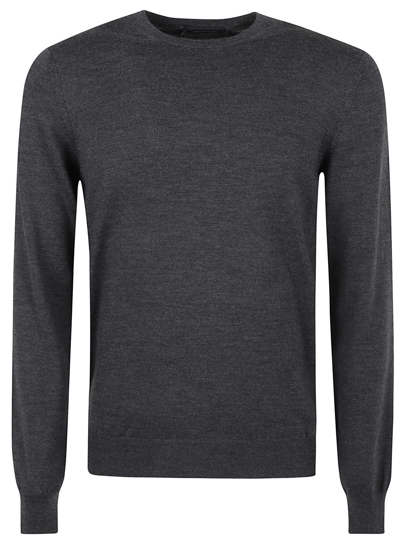 dark grey virgin wool fine knit crew neck long sleeves ribbed cuffs and hem