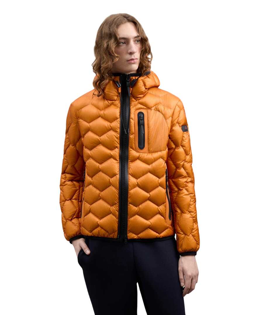 Down jacket with geometric patterned quilt composed mainly of 7den nylon ripstop, a super fine but particularly tear-resistant fabric, with a shiny appearance and, secondarily, of multi-burr stretch nylon canvas coupled with a soft and warm nylon jersey thanks to its fineness of the yarns used. Side welt pockets with zip and heat-sealed chest pocket to give greater technicality to the garment. Heat-sealed zips are designed to be water and wind resistant, preventing moisture and air from penetrating through the zip, protecting from the cold and the elements. Full central reverse coated spiral zip, zip pullers on the pockets and the details on the cuffs and hood are black and emphasize the sportswear aspect of the garment. Certified natural down padding. A dynamic and contemporary style perfect for those who love sport and an active life. Quilt with geometric pattern Heat-sealed zips Fixed hood Black details