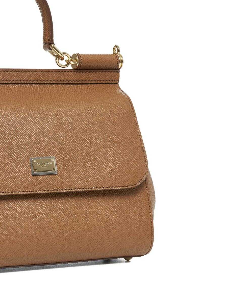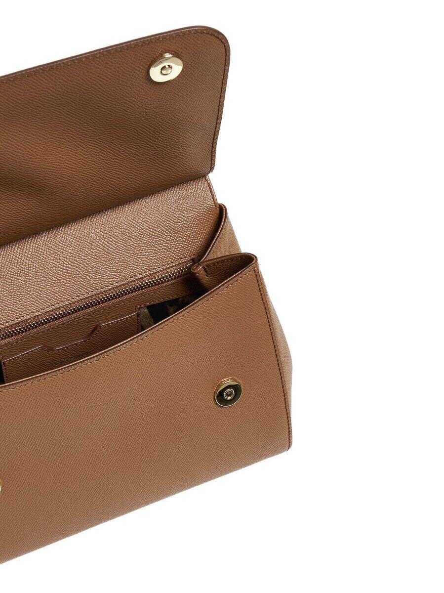 Dolce & Gabbana’s Sicily large bag in caramel-tone Dauphine leather featuring a top handle, adjustable and detachable shoulder strap, flap with logo plaque and concealed magnetic fastening, internal zip pocket, one flat pocket, leopard print fabric lining, protective feet and gold-tone metal hardware.