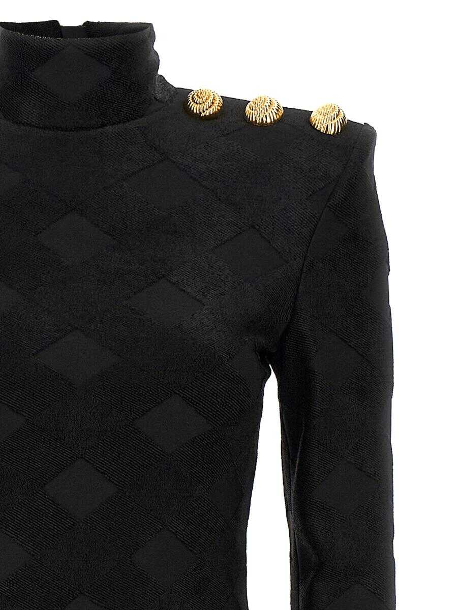 Long vichy bouclette knit dress, high neck, gold metal 'Chiocciola' button appliqué, long sleeves, padded shoulders, back zip closure
