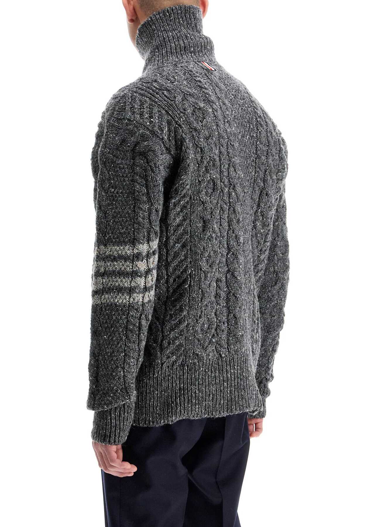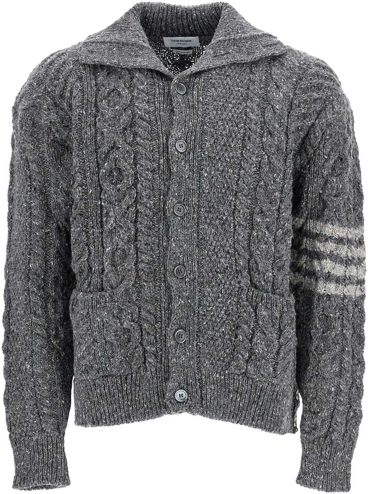 This Thom Browne cardigan is made of a blend of mohair and features a cable knit design. It is adorned with the iconic 4-bar contrast detail on the left sleeve and finished with an asymmetrical hem complete with tricolor grosgrain inserts on the side slits. The spread convertible collar allows for a versatile, buttoned-up look, while the front closure buttons and signature tab on the back add to its unique style. This regular fit cardigan is modeled by someone who