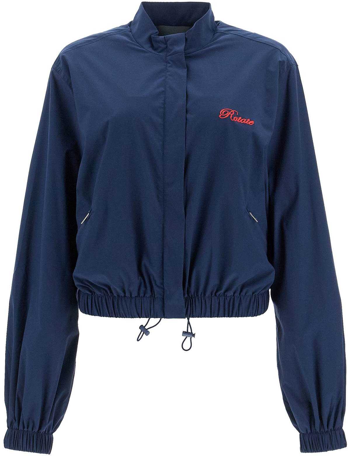 The Rotate lightweight blouson is made of recycled and stretch technical crepe, featuring a short and boxy fit and decorated with a contrasting embroidered logo on the chest. It has a stand-up collar, zip and hidden snap button closure, oblique zip pockets, elasticated cuffs and waistband, and a drawstring at the bottom. The lining is made of mesh. The model is 177 cm tall and wears size S.