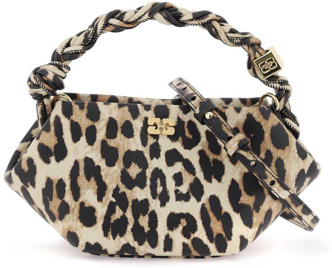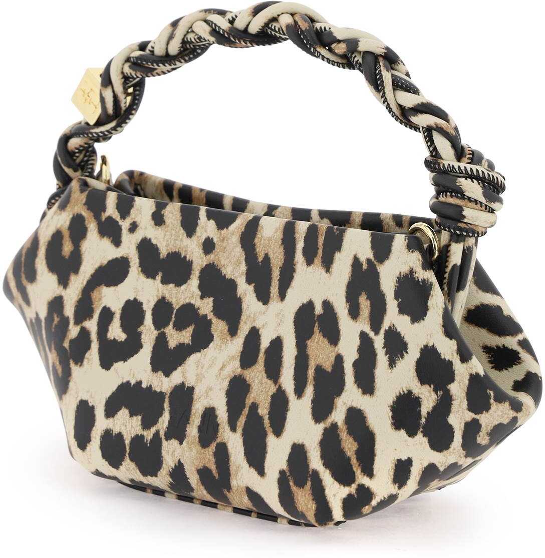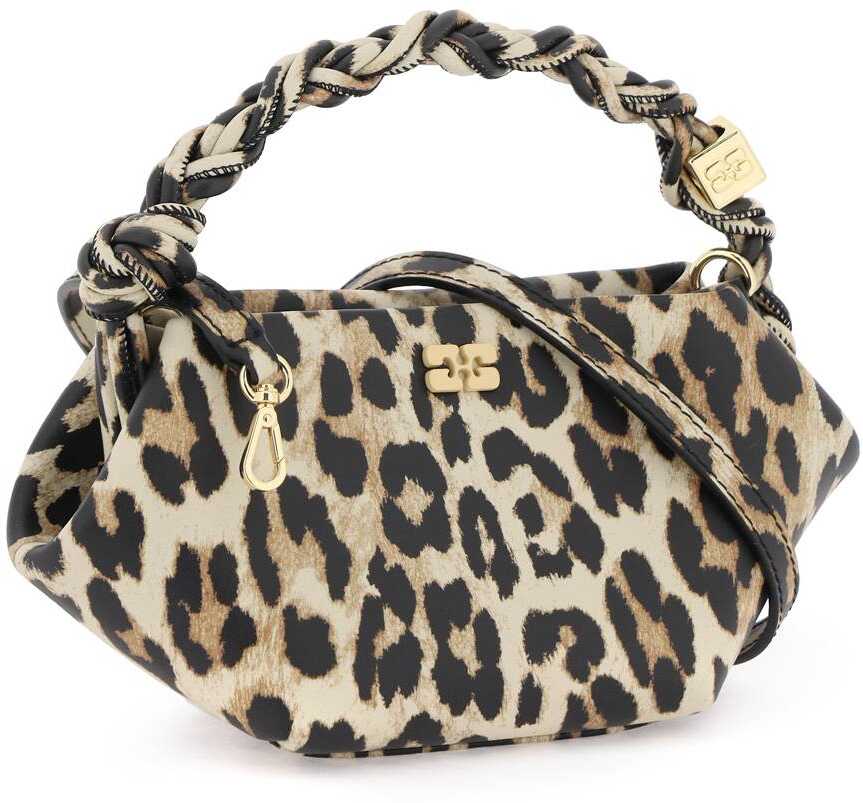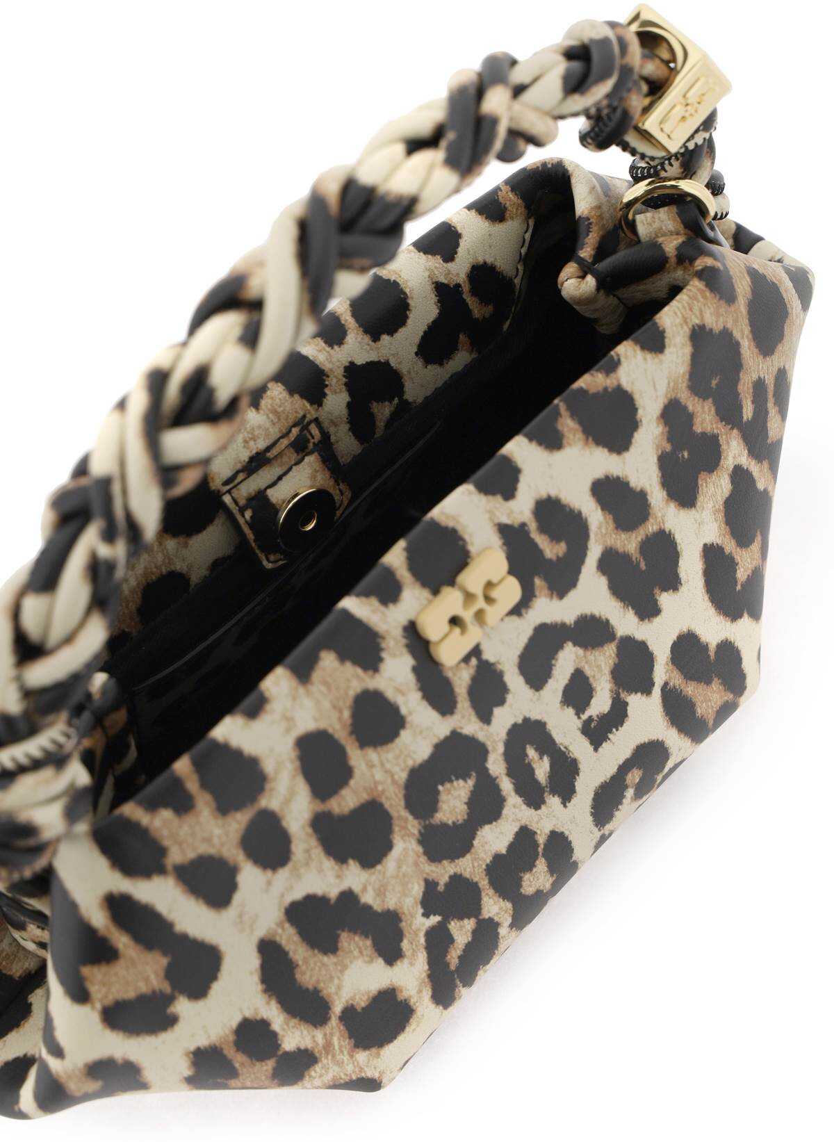 The GANNI Leopard Mini Bag is made from recycled leather and features a leopard print, hexagonal shape, and braided handle with gold metal detailing. The Butterfly logo is applied on the front, with a magnetic closure and a fabric-lined interior with a credit card slot. It also comes with an adjustable and removable matching shoulder strap.