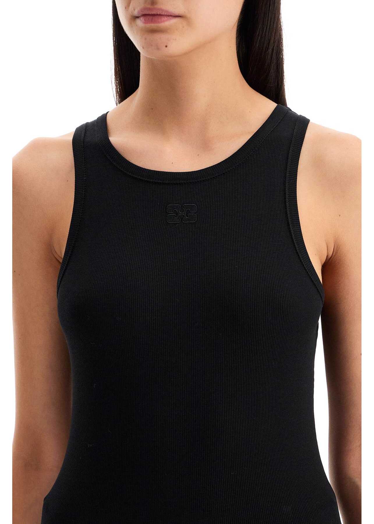 This fitted Ganni tank top is made of lightweight, ribbed stretch organic cotton jersey. This model features a round neckline, wide armholes, and an embroidered logo detail at center chest. The model is 177 cm tall and wears size XS.