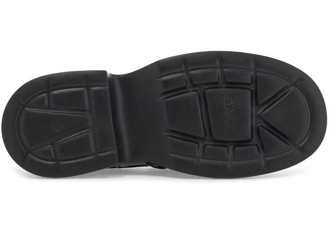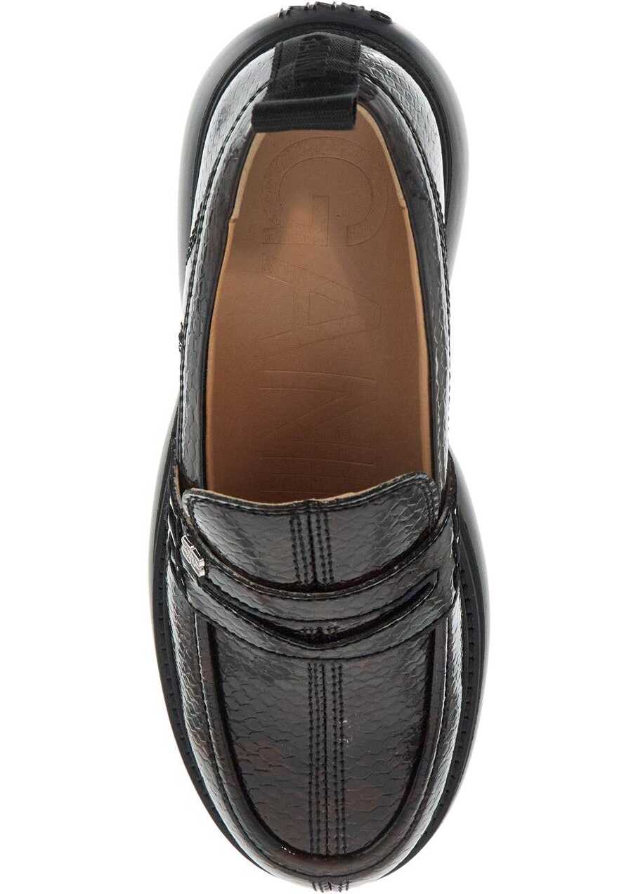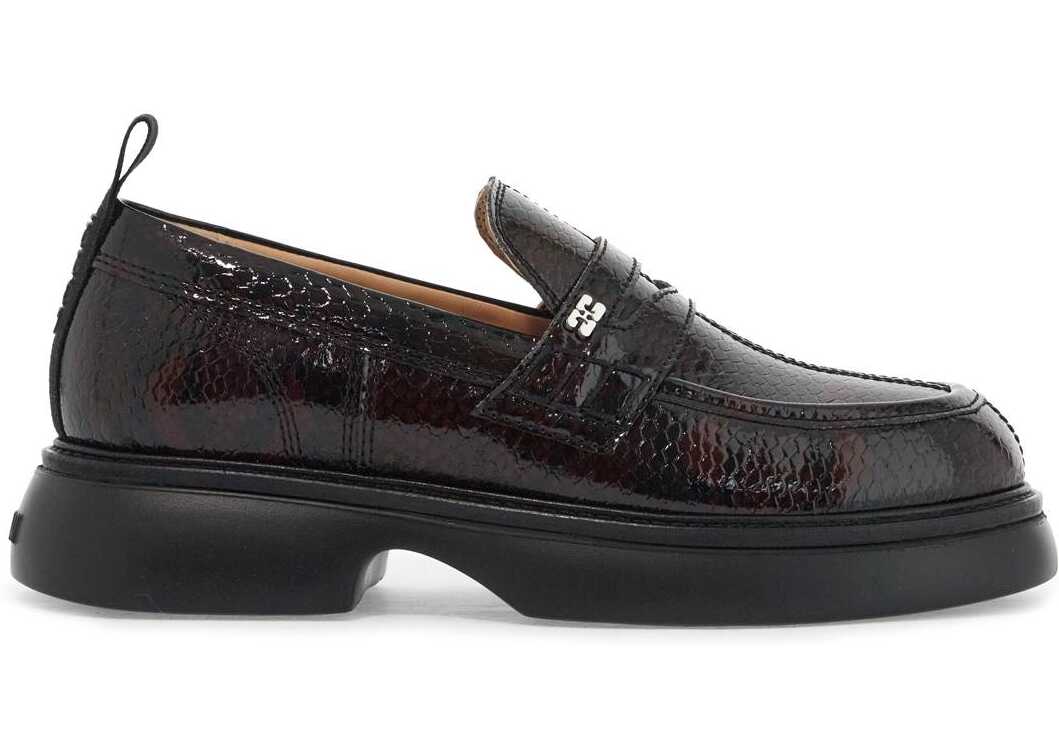 Ganni's Everyday Moccasins are made of shiny and python-embossed faux leather, featuring a small silver metal Butterfly logo on the vamp. They have a back strap in ribbon, an interior lined with faux leather, a removable insole, and a chunky rubber sole.