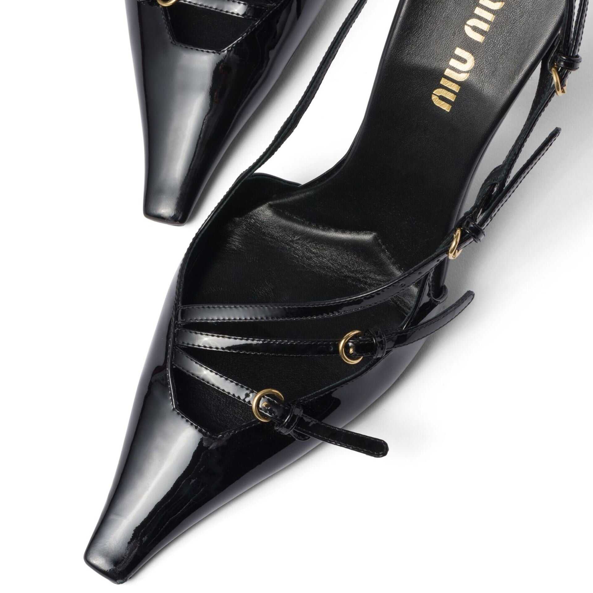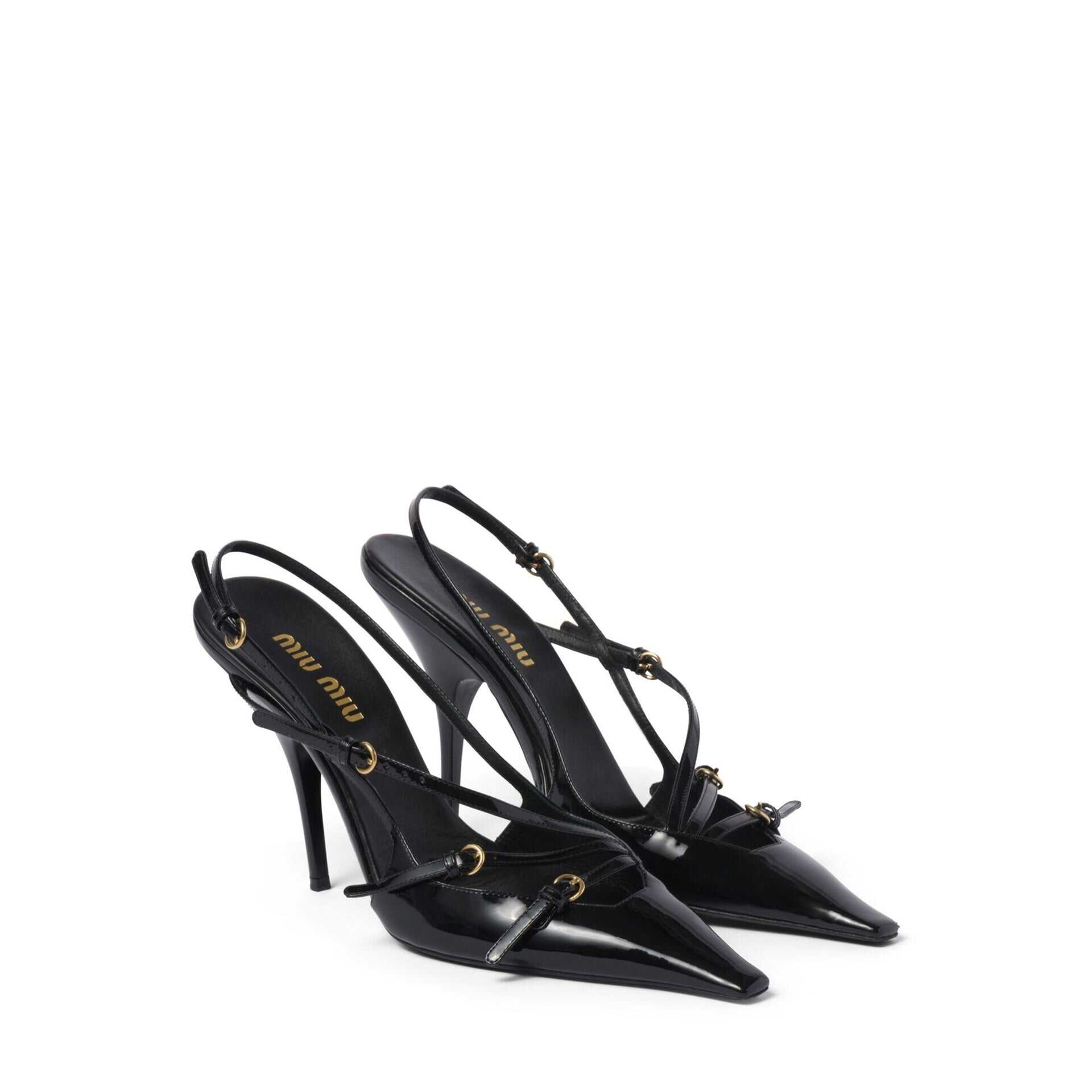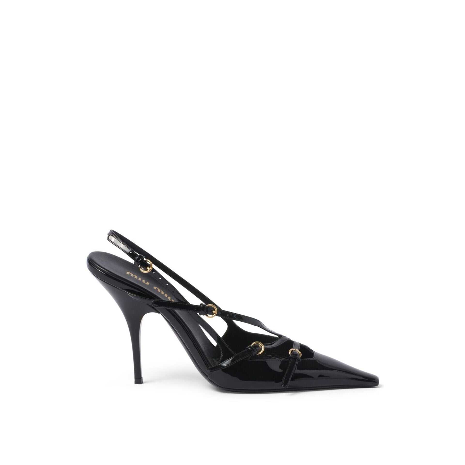 - Composition: 100% calf leather - Inner: Leather - Insole: Leather - Sole: Leather - Pointed toe - Patent effect - Branded insole - Open back - Heel 10,5 cm - Top buckle closure - Made in Italy - Gender: WOMEN - MPN 5I013EFM105069_F0002 - Code: SHO MU 2 PM FW24 11864