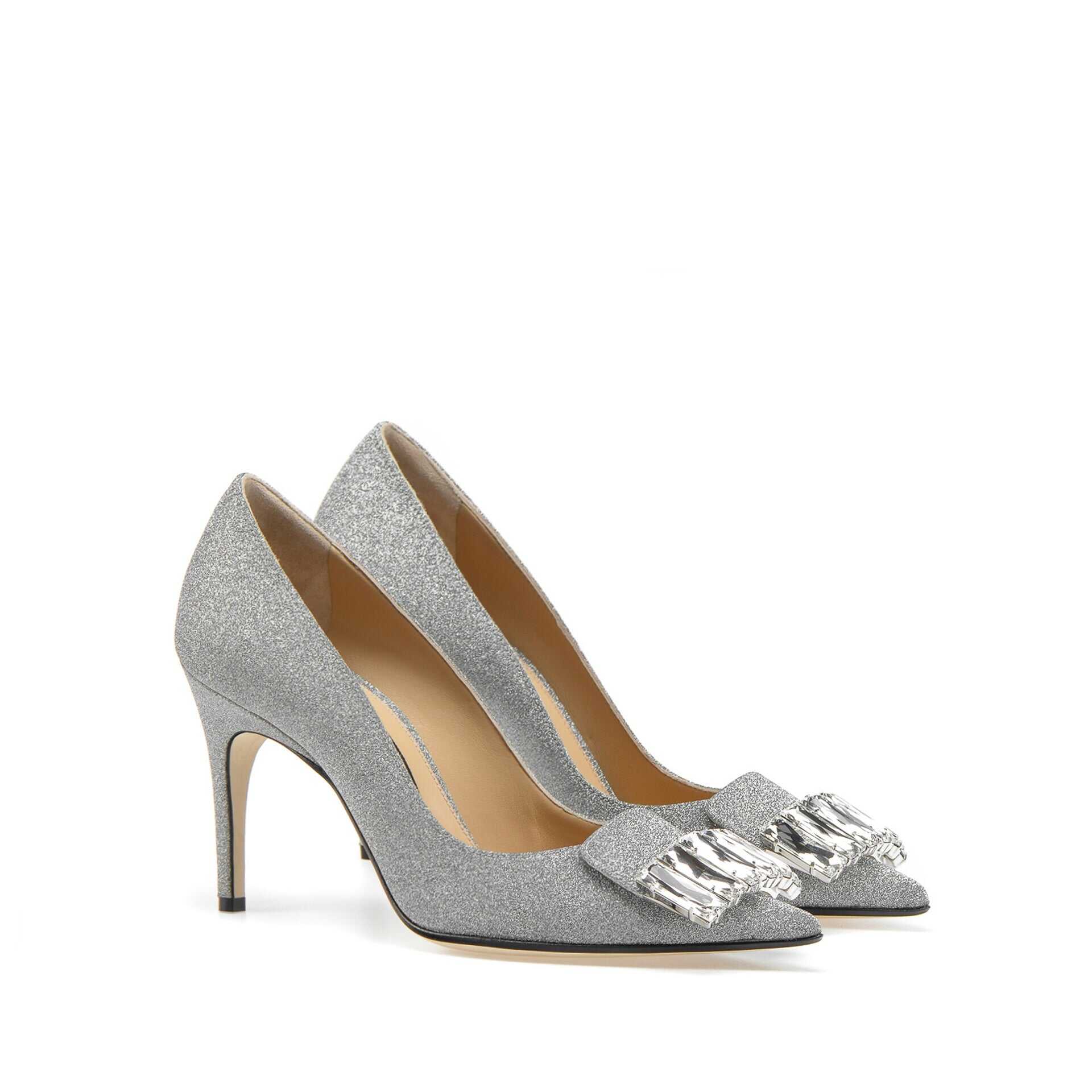 - Composition: 100% Fabric - Inner: Leather - Insole: Leather - Sole: Leather - Pointed toe - Branded insole - Heel 9 cm - Slip-on design - All-over glitter - Top crystals detail - Made in Italy - Gender: WOMEN - MPN A81782MFN424110_8198 - Barcode: 8082743571 - Code: SHO SE 2 PM FW24 11365