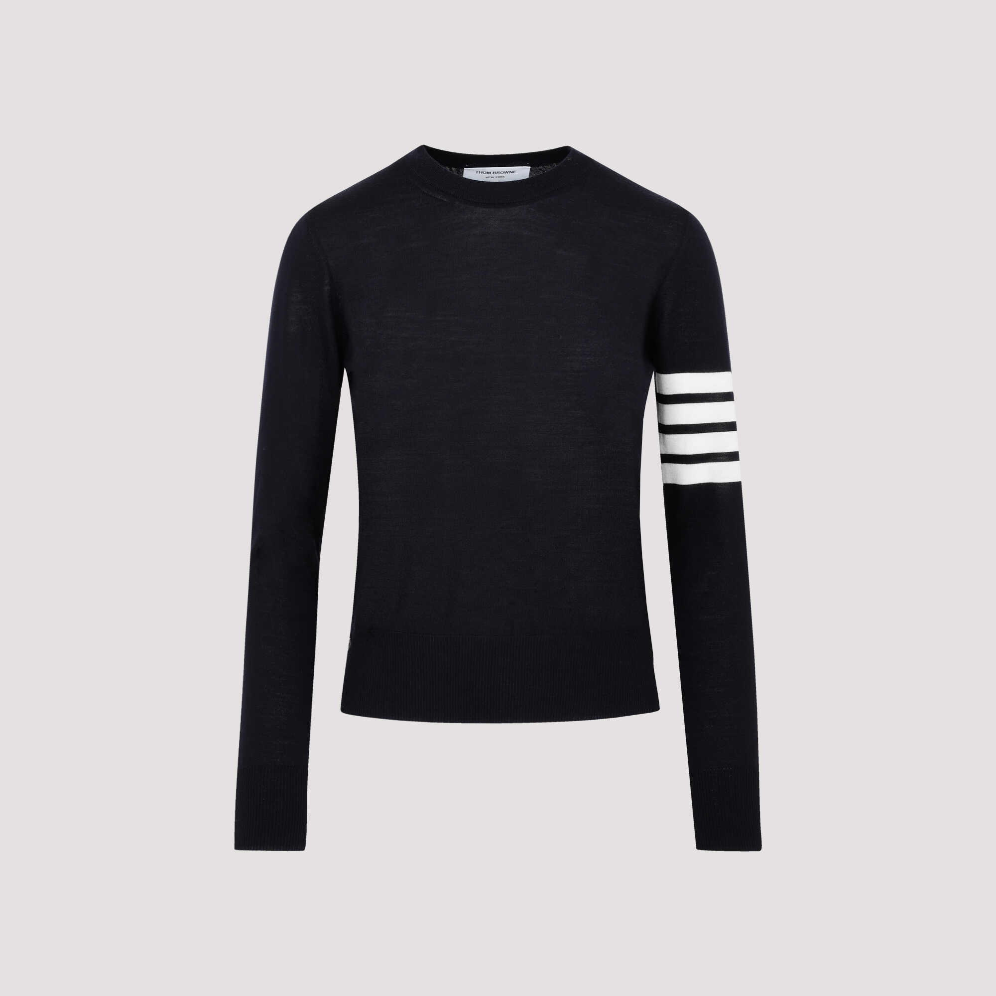 Elevate your wardrobe with this stunning Thom Browne navy wool sweater. Crafted from luxurious virgin wool, it features a classic crew neckline, long sleeves with signature stripes, and buttoned cuffs and waist for a stylish touch. The straight hem and regular fit make it a versatile and chic addition to any outfit. Perfect for women who appreciate quality and classic design.