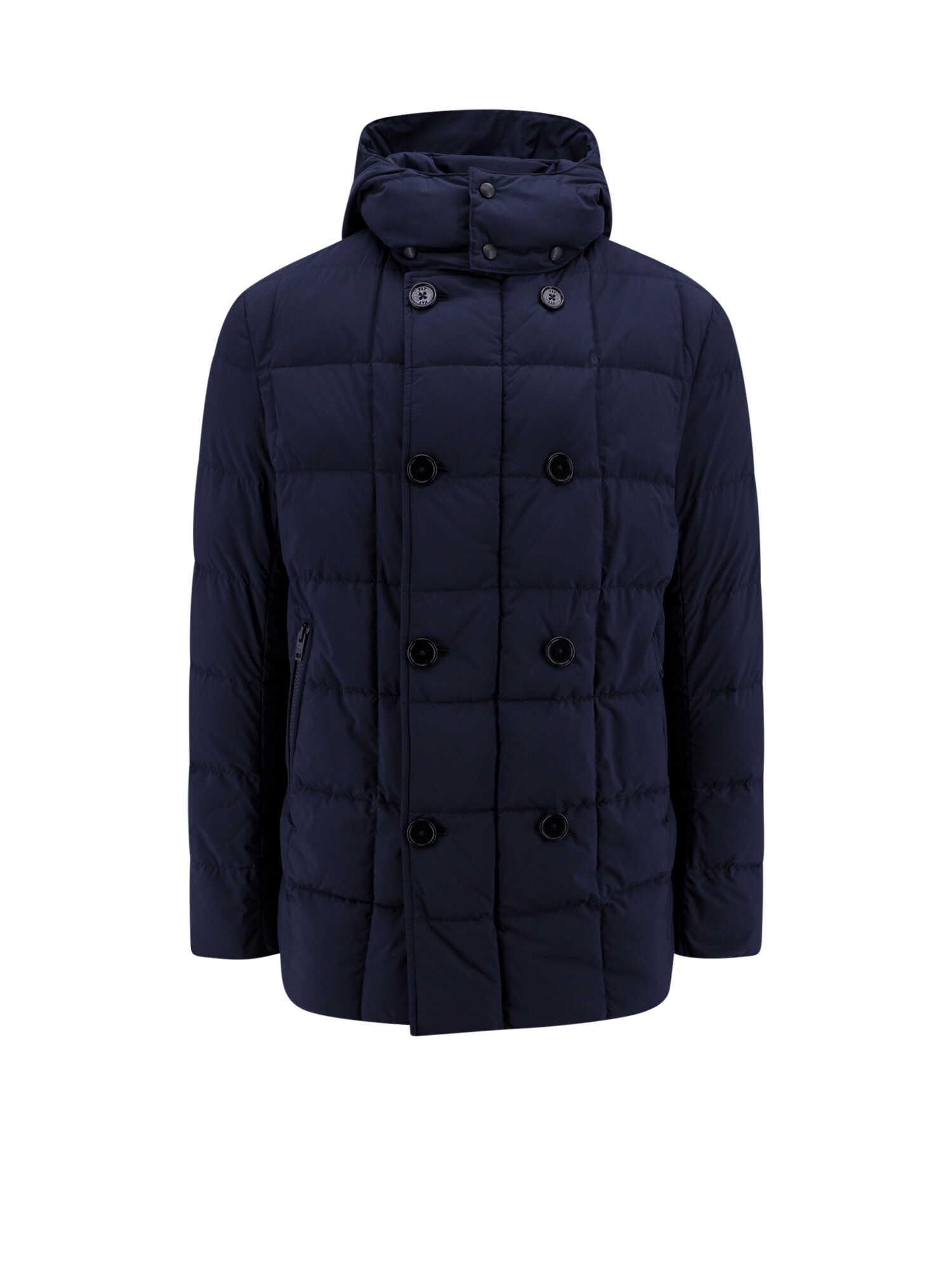 Stay warm and stylish with this blue padded and quilted nylon jacket from FAY. It features a removable hood with snap buttons, a double-breasted closure with buttons and zip, and front pockets with zip. Made in Italy with 100% polyester material and padded with 90% down and 10% feather, this jacket is perfect for the colder seasons. Size Range: LETTERS. Upgrade your wardrobe with this trendy and high-quality jacket.