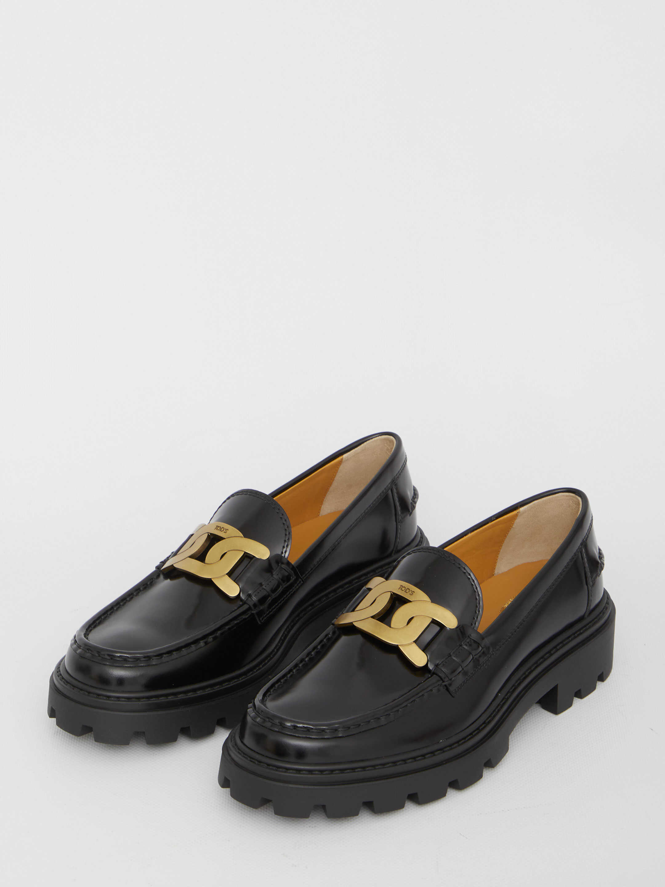 Kate loafers made of black brushed leather with metal chain detail. They feature a rubber heel and rubber lug sole. ITA size. The shoes are 100% leather and belong to the brand TOD'S. Get ready to step out in style with these chic and comfortable loafers! Perfect for any occasion, they are a must-have addition to your shoe collection. Don't miss out on the opportunity to elevate your look with these trendy Kate loafers.