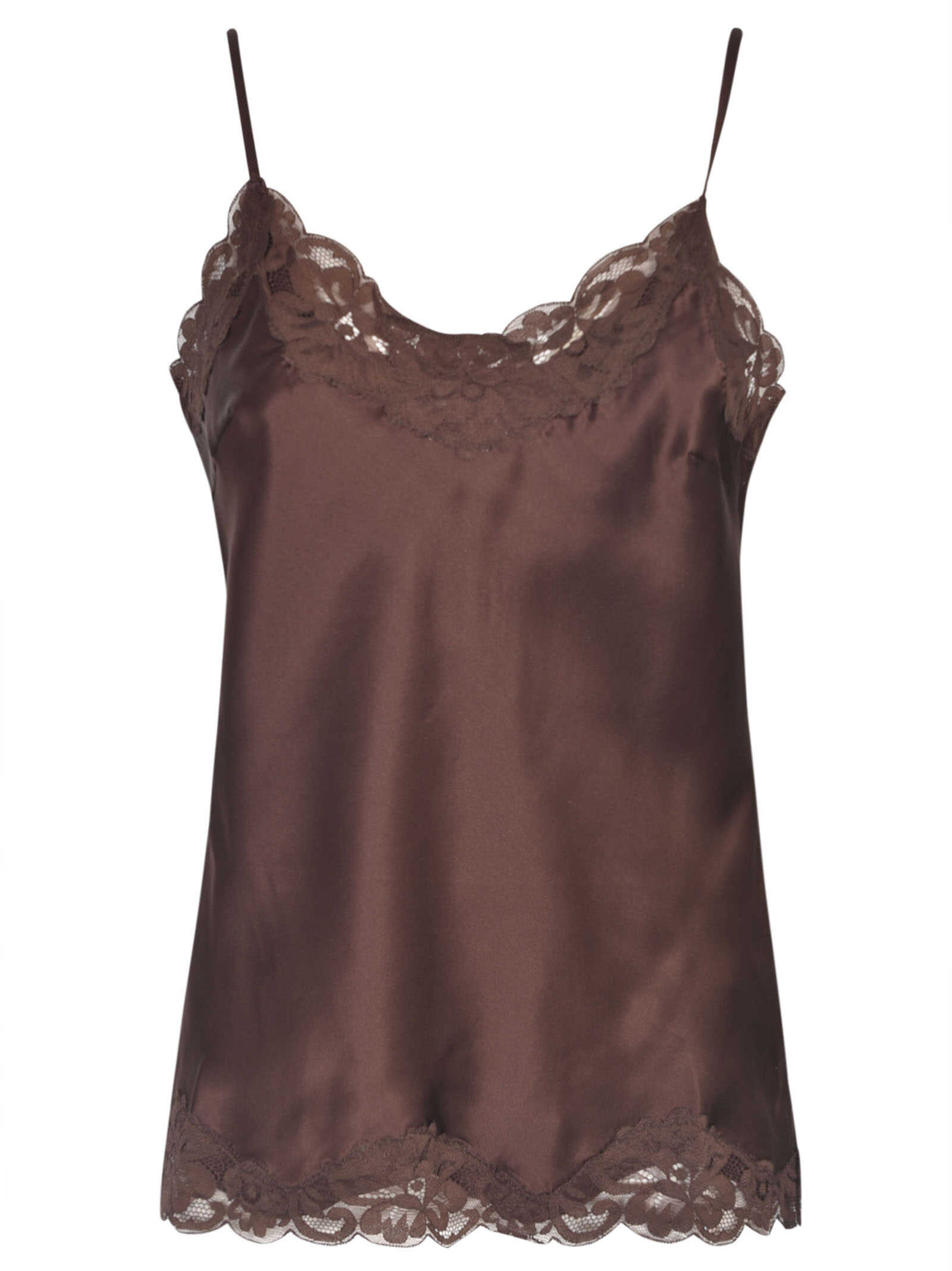 Indulge in elegance with this Dark Chocolate lace-trim slip top from GOLD HAWK. Made from 100% SILK, it features a stylish V-neck, adjustable spaghetti straps, and a scallop hem. Perfect for any occasion, this top adds a touch of sophistication to your outfit. Get ready to make heads turn with the Gold Hawk Top!