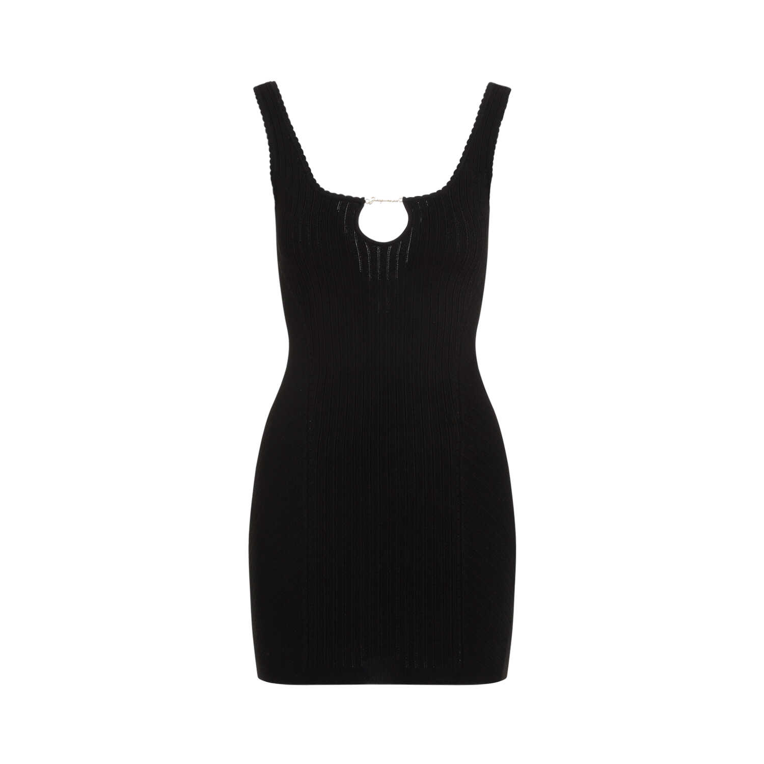 Jacquemus Black La mini robe Sierra. Black viscose blend, Rib knit, scalloped neckline and armholes. Gold metal charm logo with keyhole neckline, stretch fit. Open back.