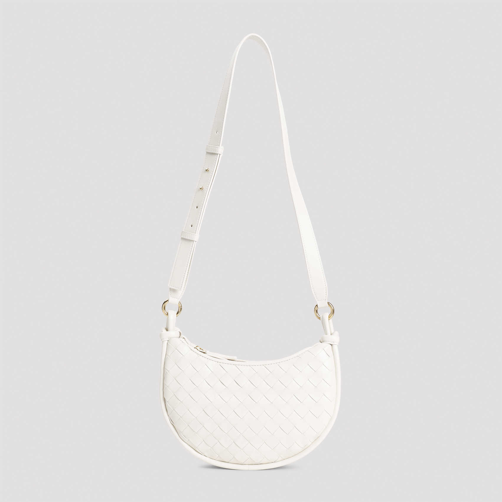 Upgrade your style with this elegant Bottega Veneta cross body bag. Crafted from luxurious sea salt white calf leather, this bag features a top adjustable shoulder strap, signature intreccio design, and gold-tone hardware. Perfect for any occasion, this bag is a must-have accessory for any fashion-forward individual. Add a touch of sophistication to your outfit with this timeless piece.
