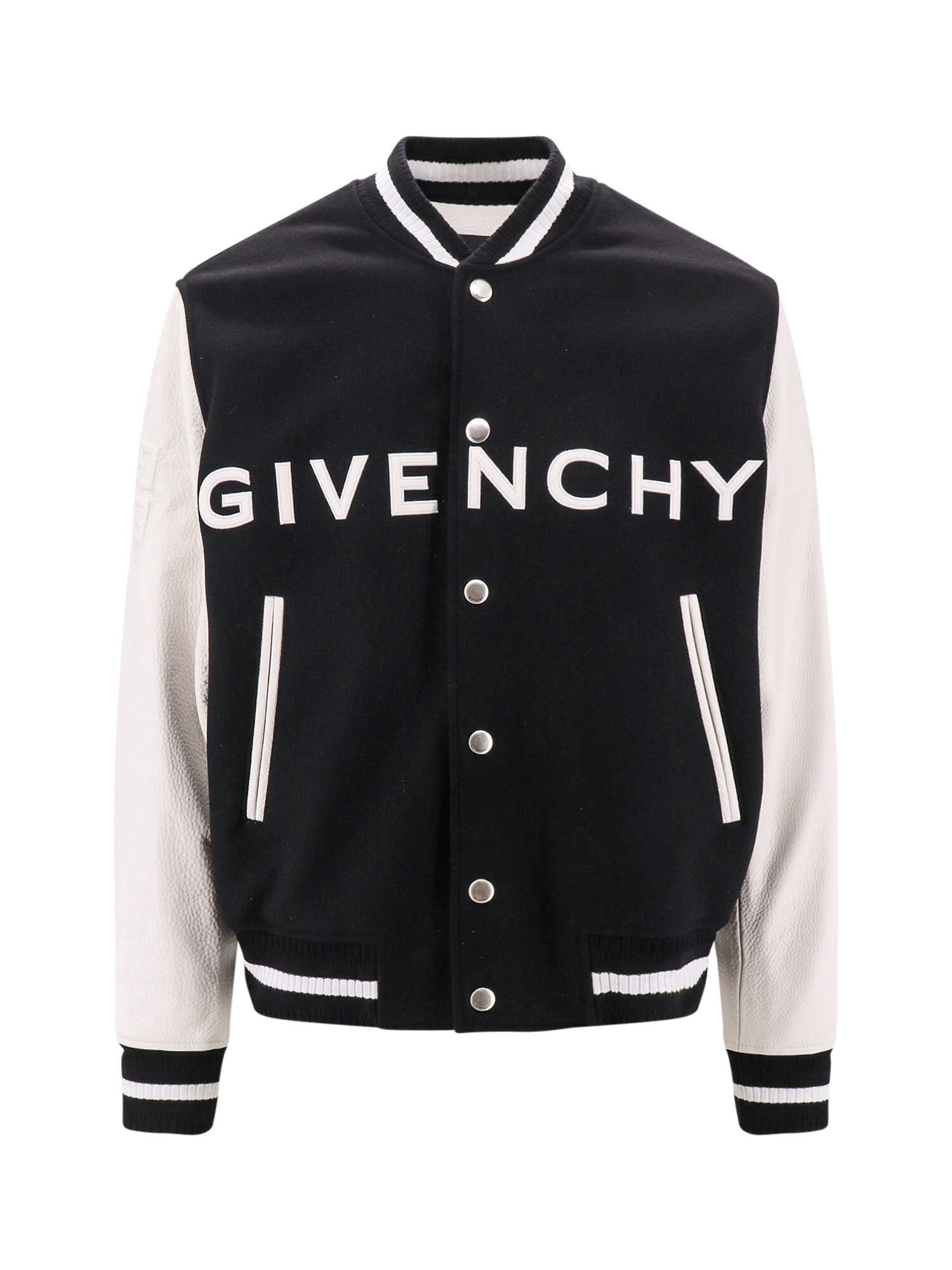 Introducing the Wool and Leather Bomber Jacket from GIVENCHY. This stylish black jacket features snap button closure, frontal welt pockets, and ribbed stretch profiles. Made in Italy with a blend of 80% Wool and 20% Polyamide - Leather. Perfect for adding a touch of sophistication to your wardrobe. Shop now!