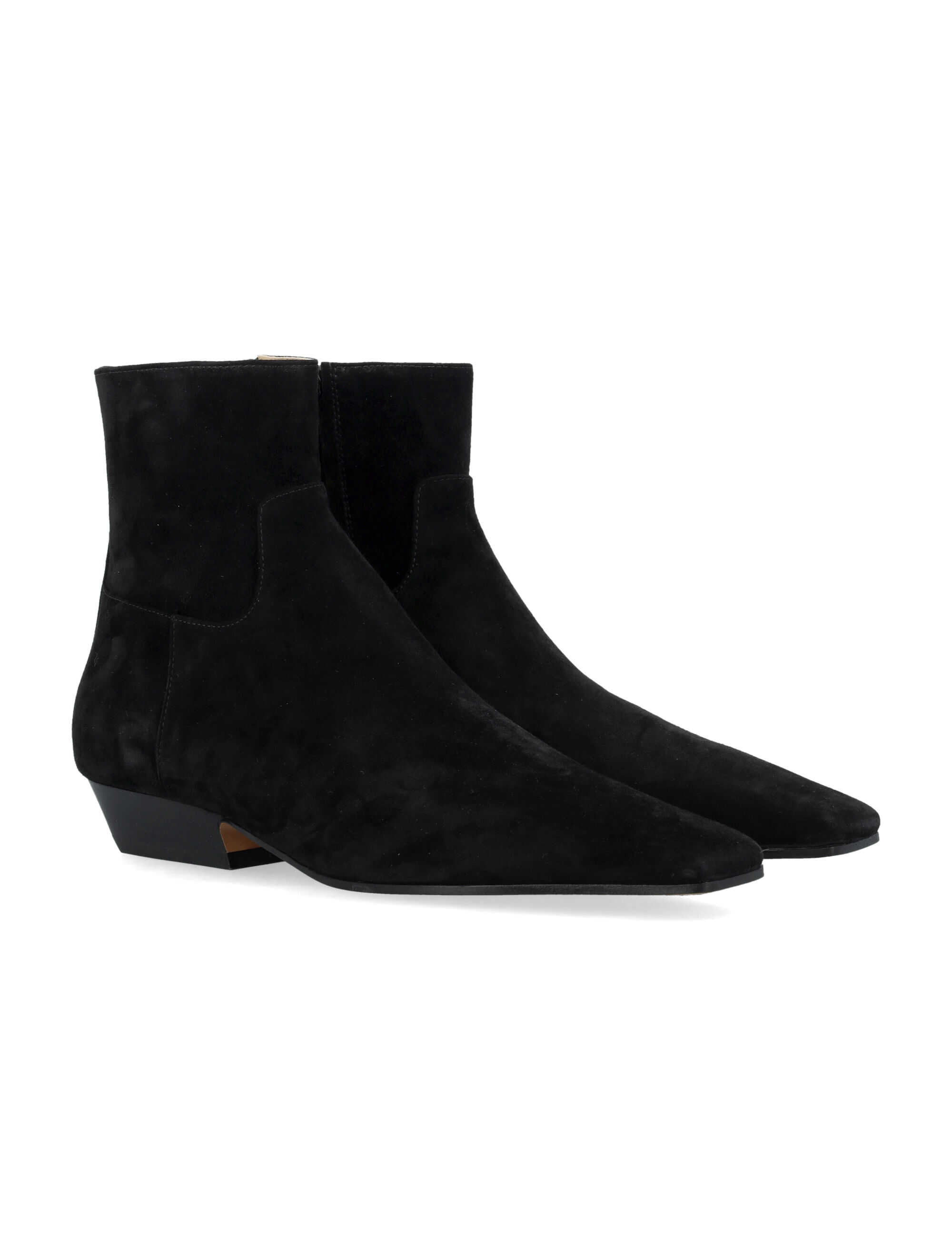 Step out in style with these chic Marfa ankle boots from Khaite. Crafted from smooth black suede, these ankle boots feature a sleek pointed toe design and a low block heel for all-day comfort. Perfect for adding a touch of sophistication to any outfit.
