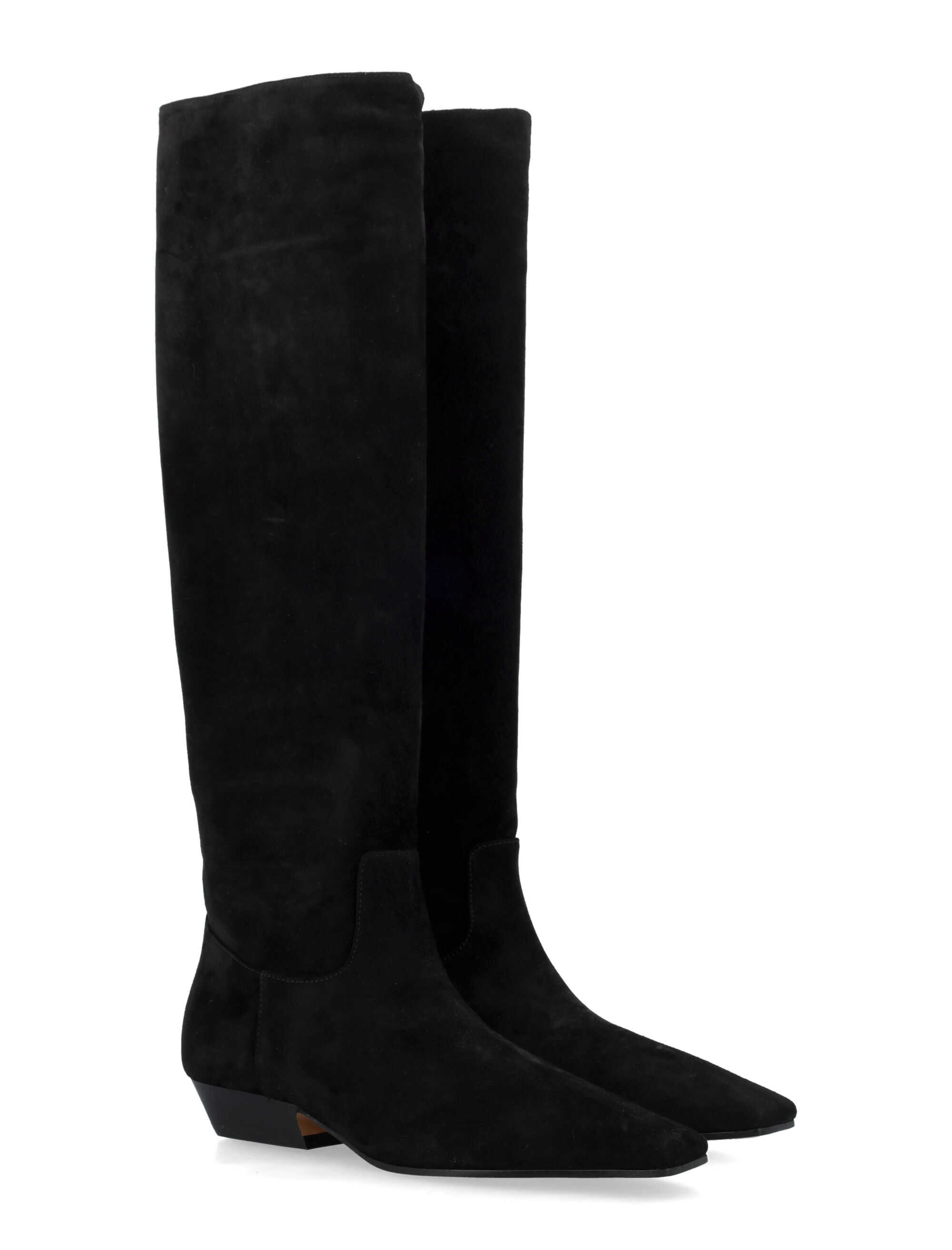 Elevate your style with the Marfa knee boots by Khaite. Crafted from smooth black suede with a knee-high silhouette, pointed toe design, and low, angled block heel. Step out in luxury and sophistication with these timeless boots.