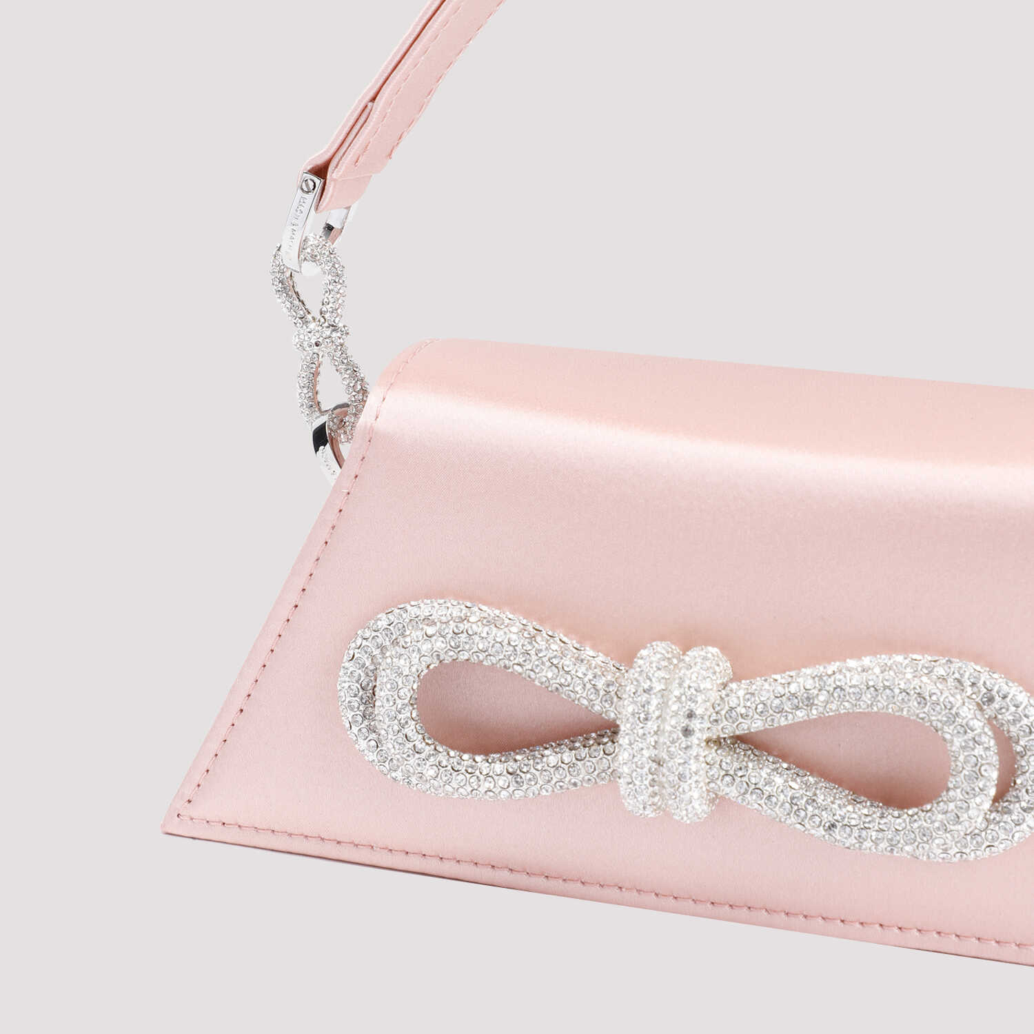 Elevate your style with the exquisite Mach & Mach nude pink satin Samantha bag. This handbag features a double bow design with silver crystal embellishments, a versatile top handle, and a detachable shoulder strap. The main compartment offers ample space for your essentials. Perfect for adding a touch of glamour to any outfit. Shop now and make a statement!