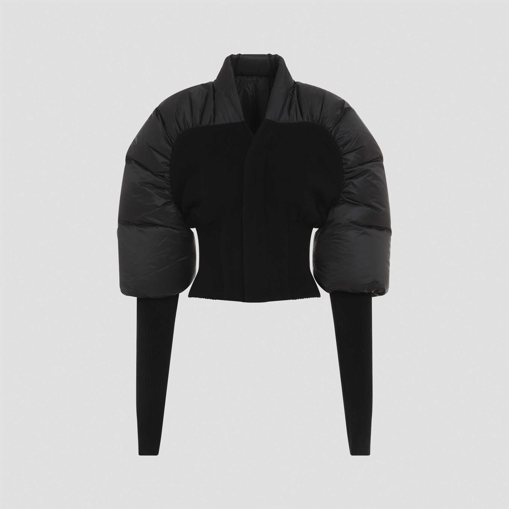 Stay stylish and warm in this luxurious black polyamide coat from RICK OWENS. Featuring a unique bodice-effect design, padded shoulders, and exaggerated ribbed cuffs, this jacket is perfect for adding a touch of edge to your winter wardrobe. Crafted from a blend of polyamide, cashmere, and wool, it offers both comfort and style. Elevate your look with this statement piece.