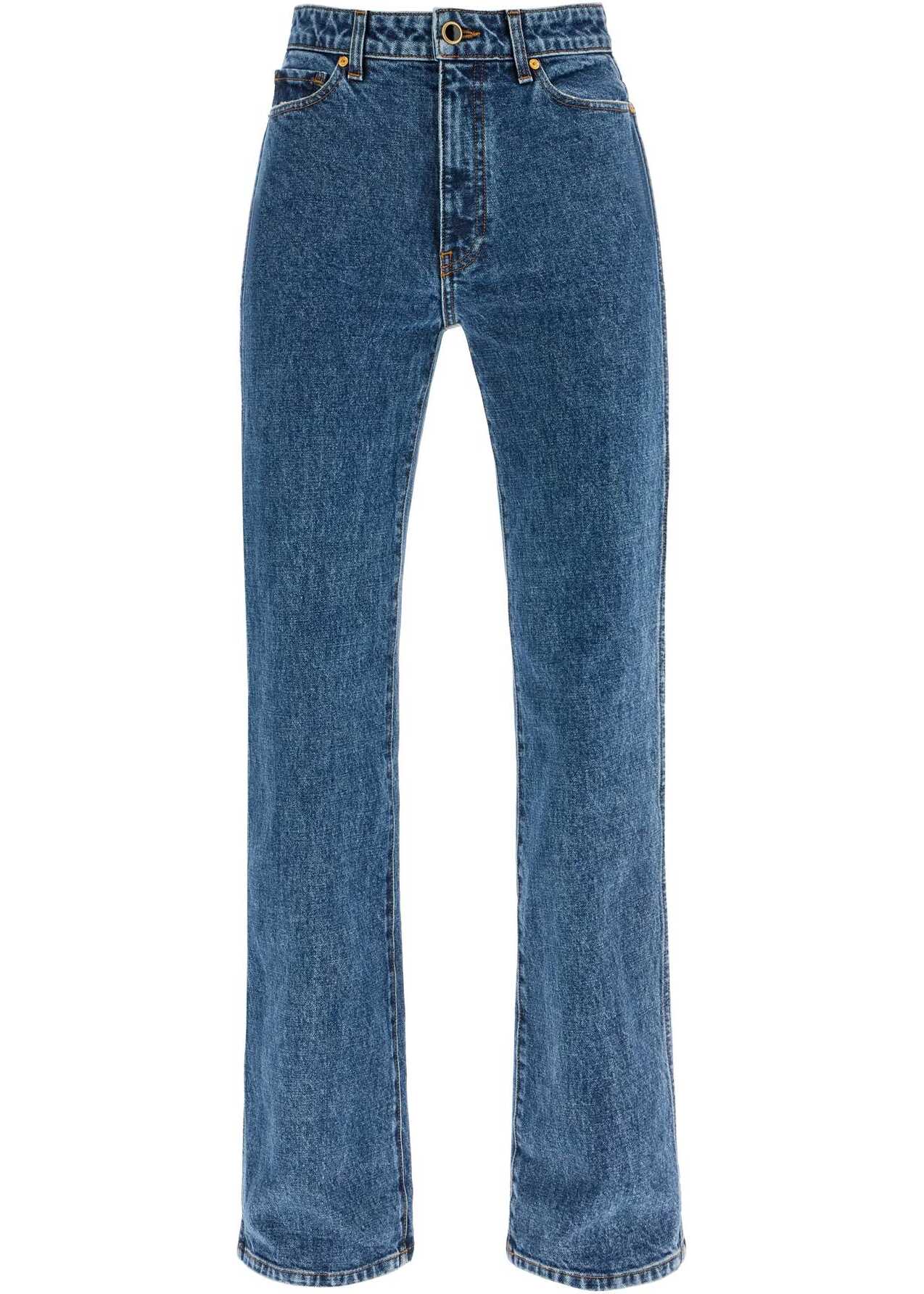 High-waisted Khaite jeans made of cotton denim with a classic five-pocket design, straight leg and a slight distressed effect on the edges. Hidden zip and button closure. The model is 177 cm tall and wears size 26.
