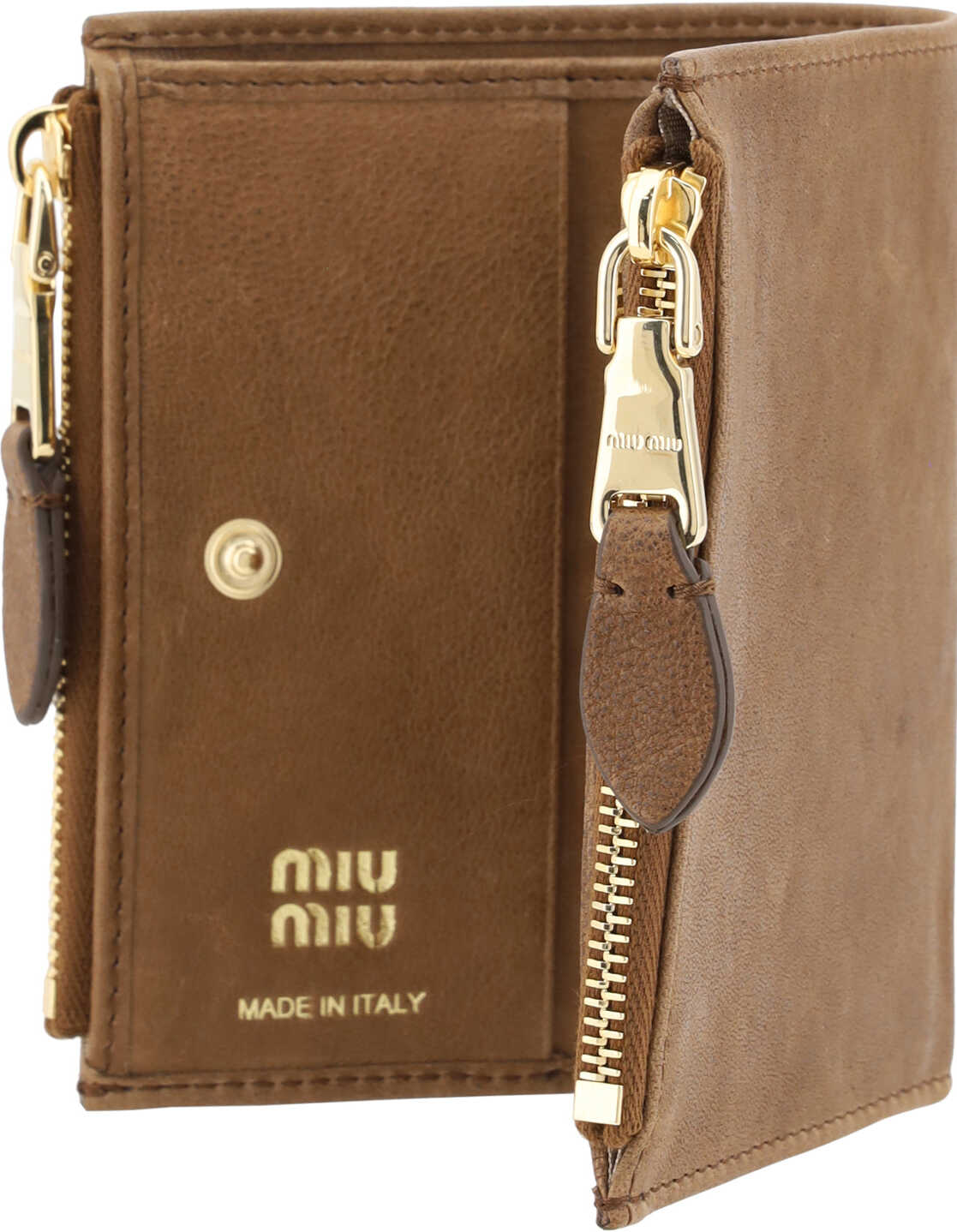 Leather Wallet by Miu Miu, suede leather design, snap button closure, interior card slot, bill compartment, two exterior zippered pockets, iconic brand monogram embossed on front.