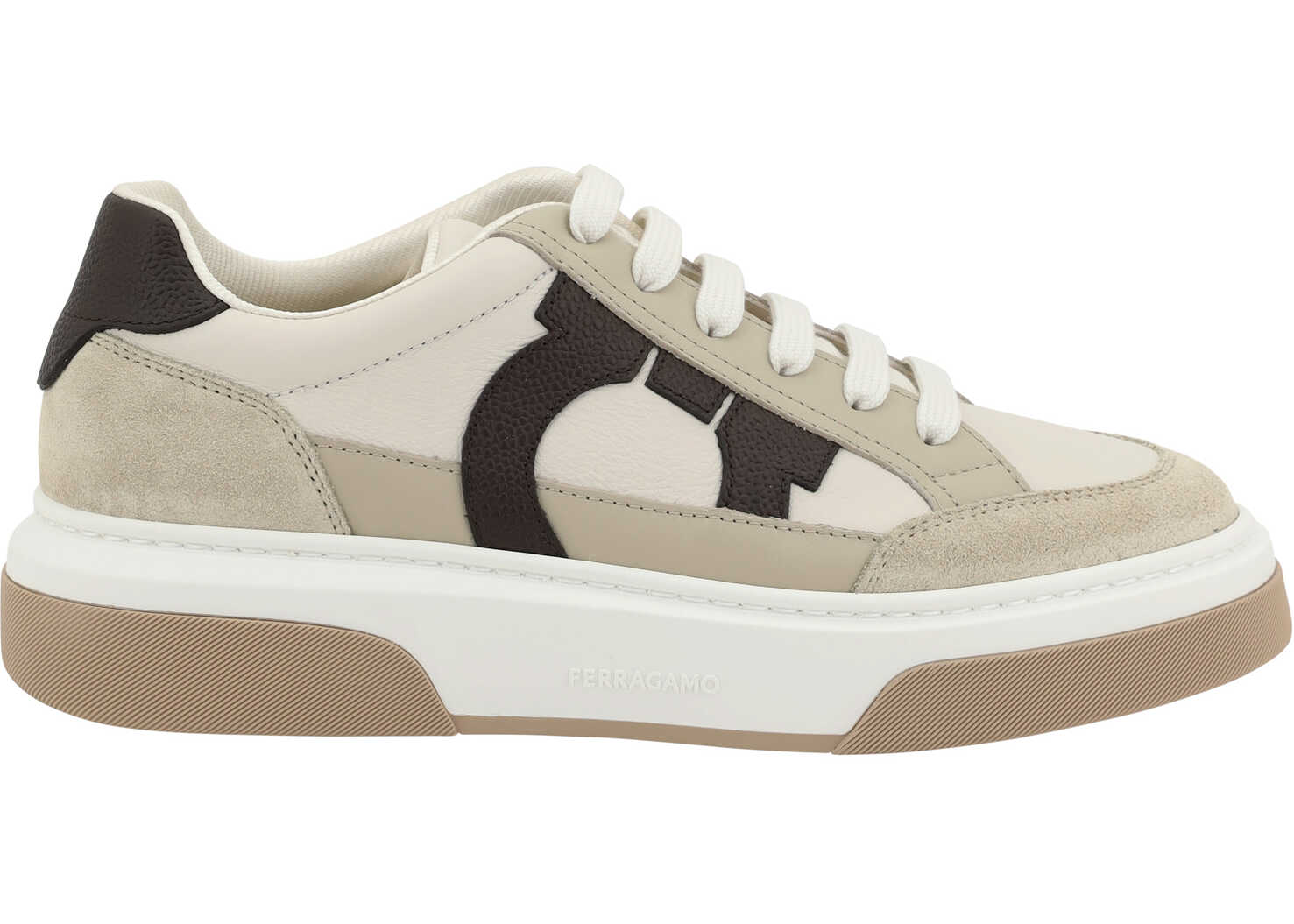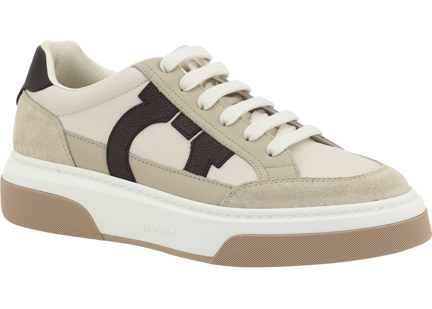 Leather Sneakers by Ferragamo, lace-up front closure, paneled design, suede inserts, contrasting iconic Gancini logo on side panel, knurled edging, logo suede label at heel, platform sole.