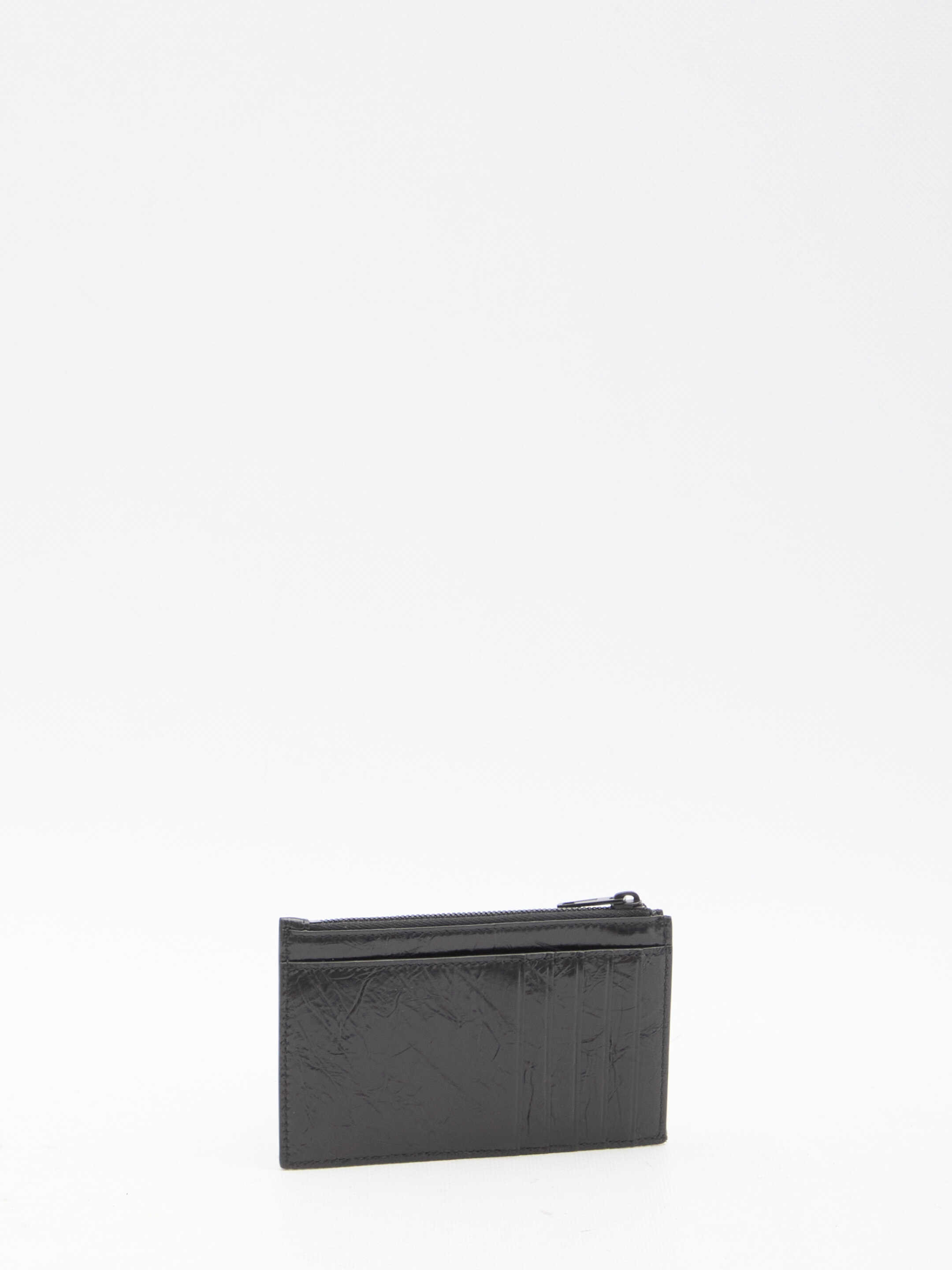 Cardholder in black Crush calfskin with black metal "B" on the front. It features one zipped coin pocket, one flat pocket and five card slots. Any leather imperfections are not to be considered manufacturing defects, but a peculiarity of the material.
