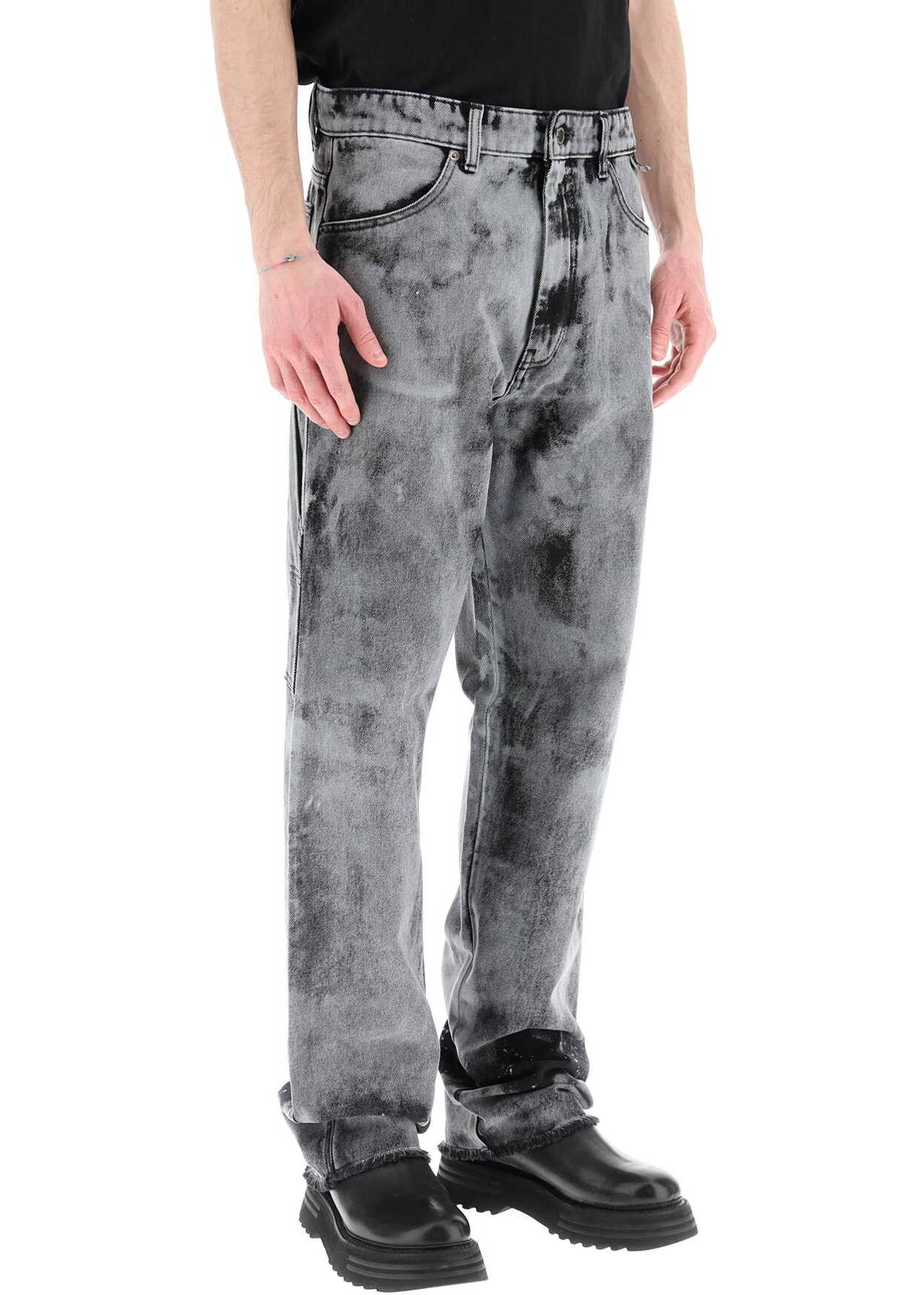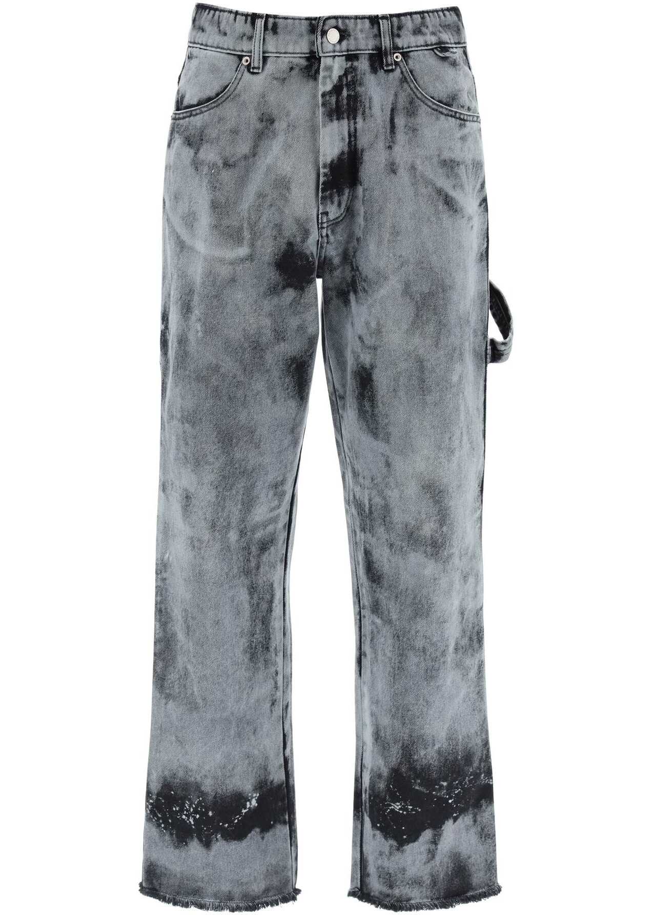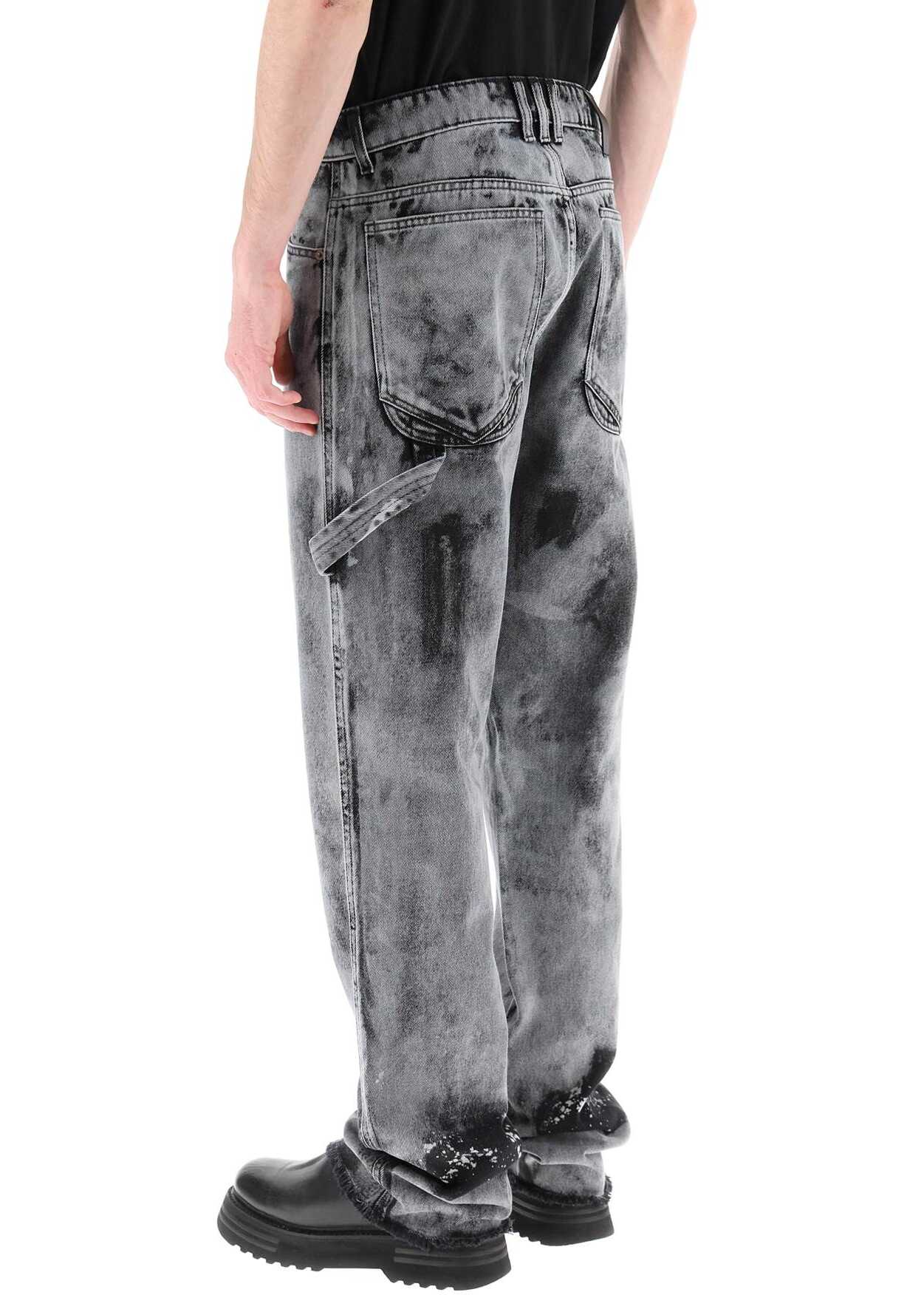 Workwear jeans by DarkPark made of overdyed cotton denim with frayed hem. They feature concealed zipper and logoed button closure, front pockets, back patch pockets, hammer loop. Baggy fit. The model is 187 cm tall and wears a size 31.