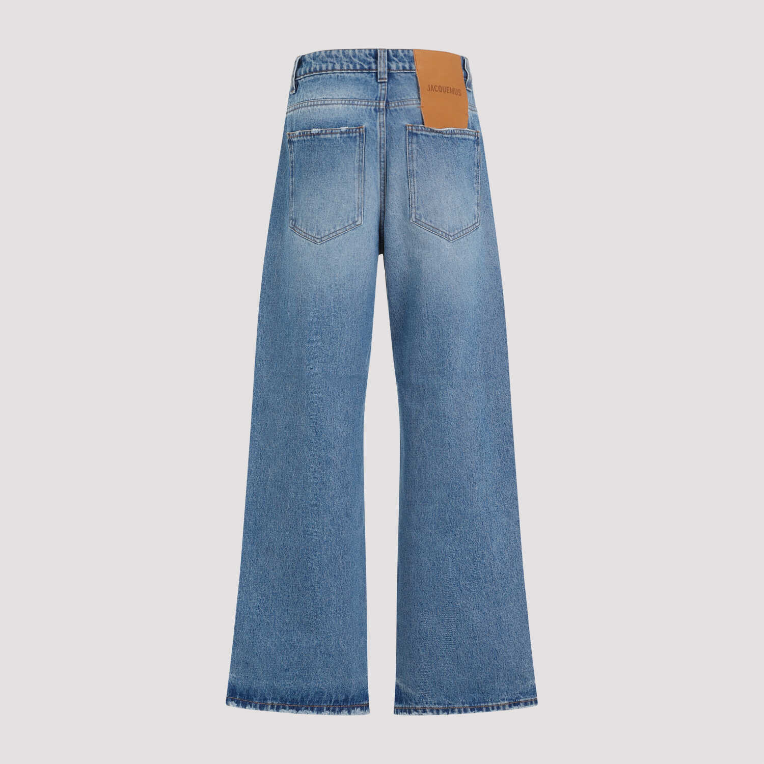 Elevate your style with these Jacquemus Le De-Nimes Large Blue Cotton Jeans. Crafted from 100% cotton, these high-waisted jeans feature a 5-pocket design, brown contrasting stitching, and a wide leg silhouette. The front button and fly-zip closure adds a touch of sophistication, while the branded label with logo at the back waist showcases the brand's signature style. Perfect for any occasion, these jeans are a versatile wardrobe staple. Order yours today!