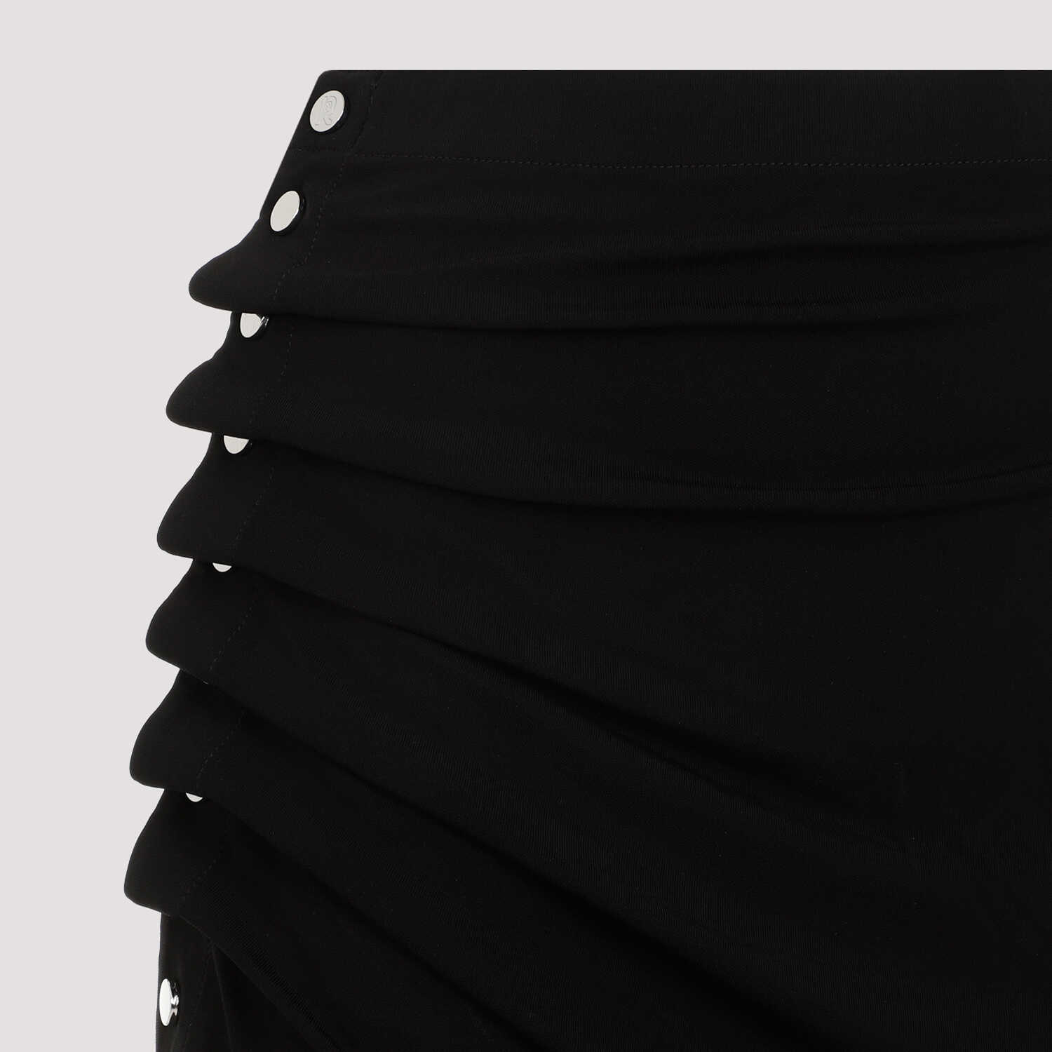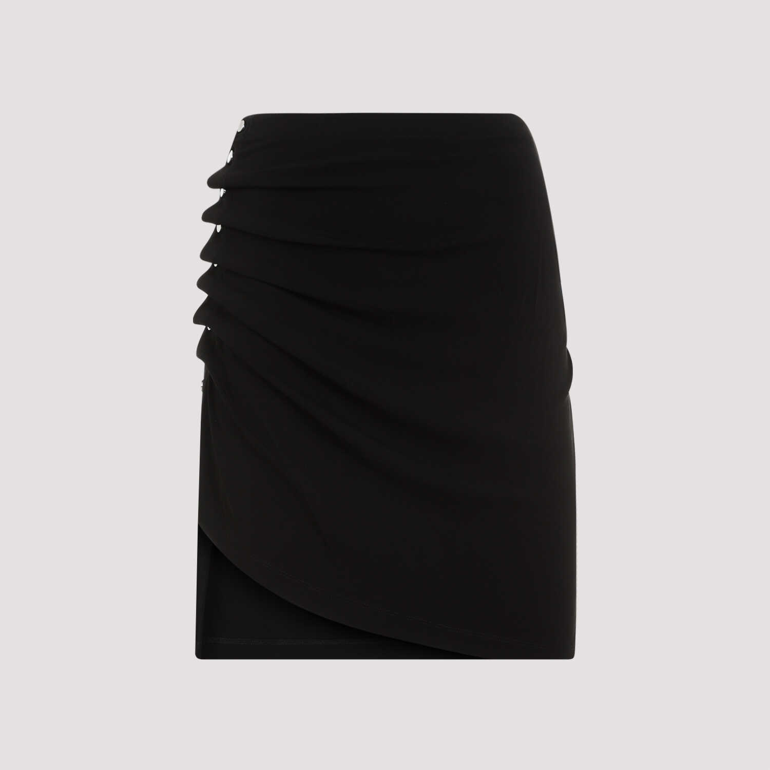 Turn heads in this stunning black mini skirt by Rabanne. The sleek design features a unique draped effect and wrapped design, perfect for a night out or a special occasion. Made from a luxurious blend of viscose and elastane, this skirt is both comfortable and stylish. Add a touch of elegance to your wardrobe with the RABANNE 24AJJU526VI0386 skirt.