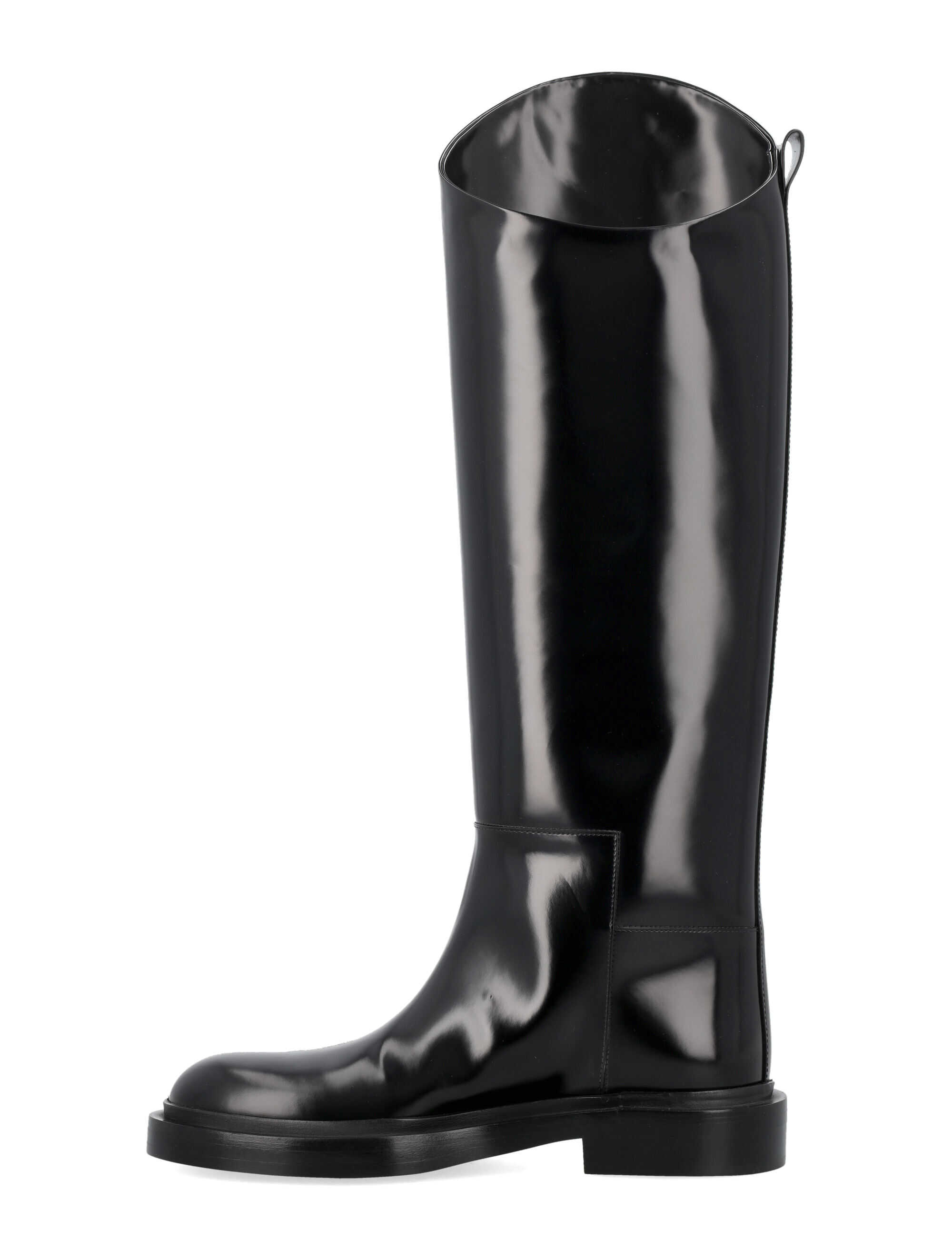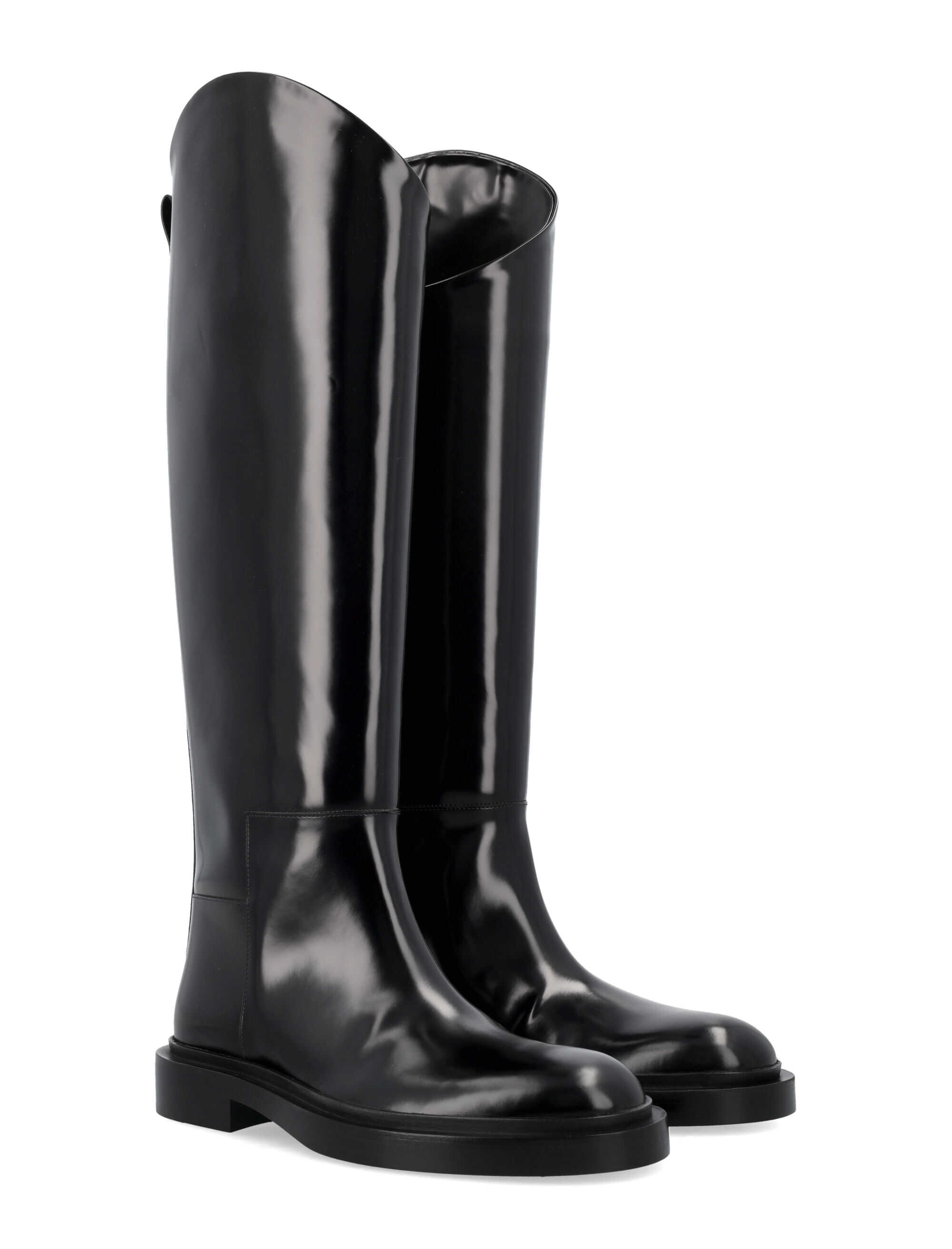 Step out in style with these sleek black leather horse boots by Jil Sander. Perfect for any occasion, these knee-high boots feature a round toe design and a comfortable rubber sole. Make a statement with these chic and sophisticated boots.