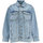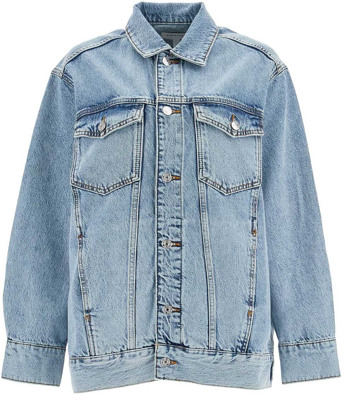 The Frame oversized jacket is made of washed cotton denim obtained from regenerative agriculture. It features branded button closure, pointed collar, front pockets with flaps, and adjustable waist and cuffs. Unlined. The model is 177 cm tall and wears size S/M.