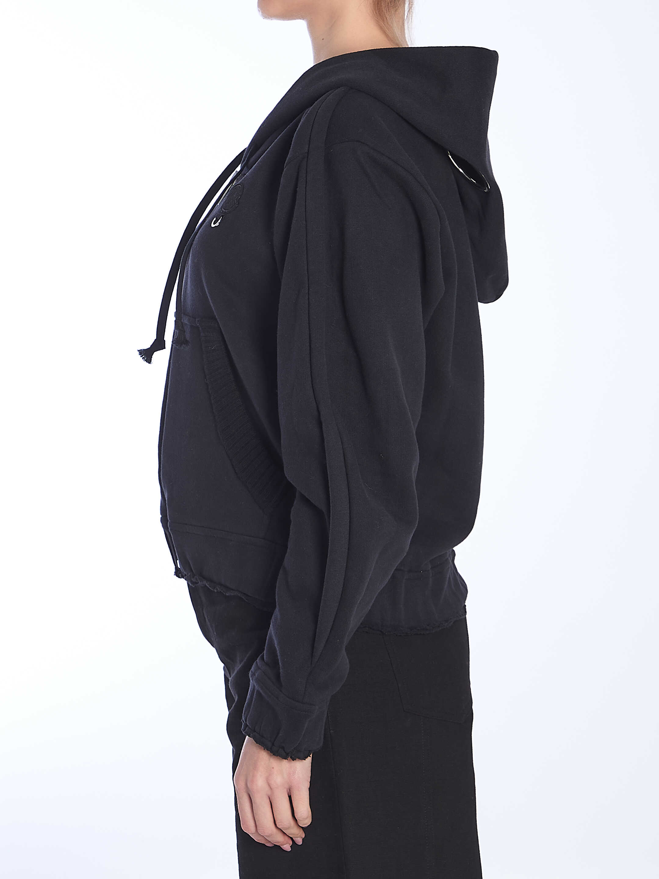 Black cotton hoodie with an adjustable hood, zip closure, kangaroo pocket, padded trim along the sleeves, and gathered cuffs and hem. It also features two maxi eyelets on the hood and a Moncler Genius patch for Willow Smith embroidered on the left sleeve with a small metal ring.