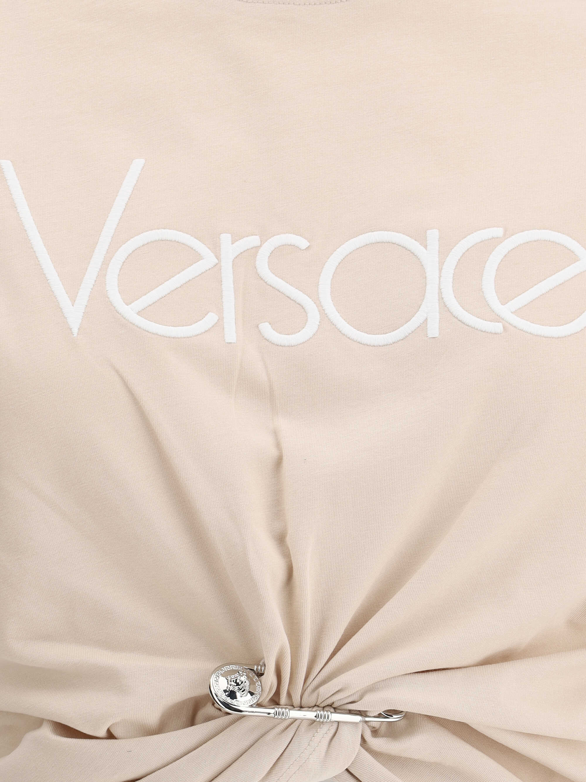 Versace's cotton T-Shirt combines contemporary minimalism with the Maison's distinctive aesthetic. Featuring a refined ribbed crew neck and cropped silhouette, it is distinguished by a front drape embellished with a Medusa logo pin. The iconic monogram stitched on the front and the monochrome pattern complete this garment with a strong and sophisticated character. Perfect for those looking for a signature T-shirt with a bold and refined style.