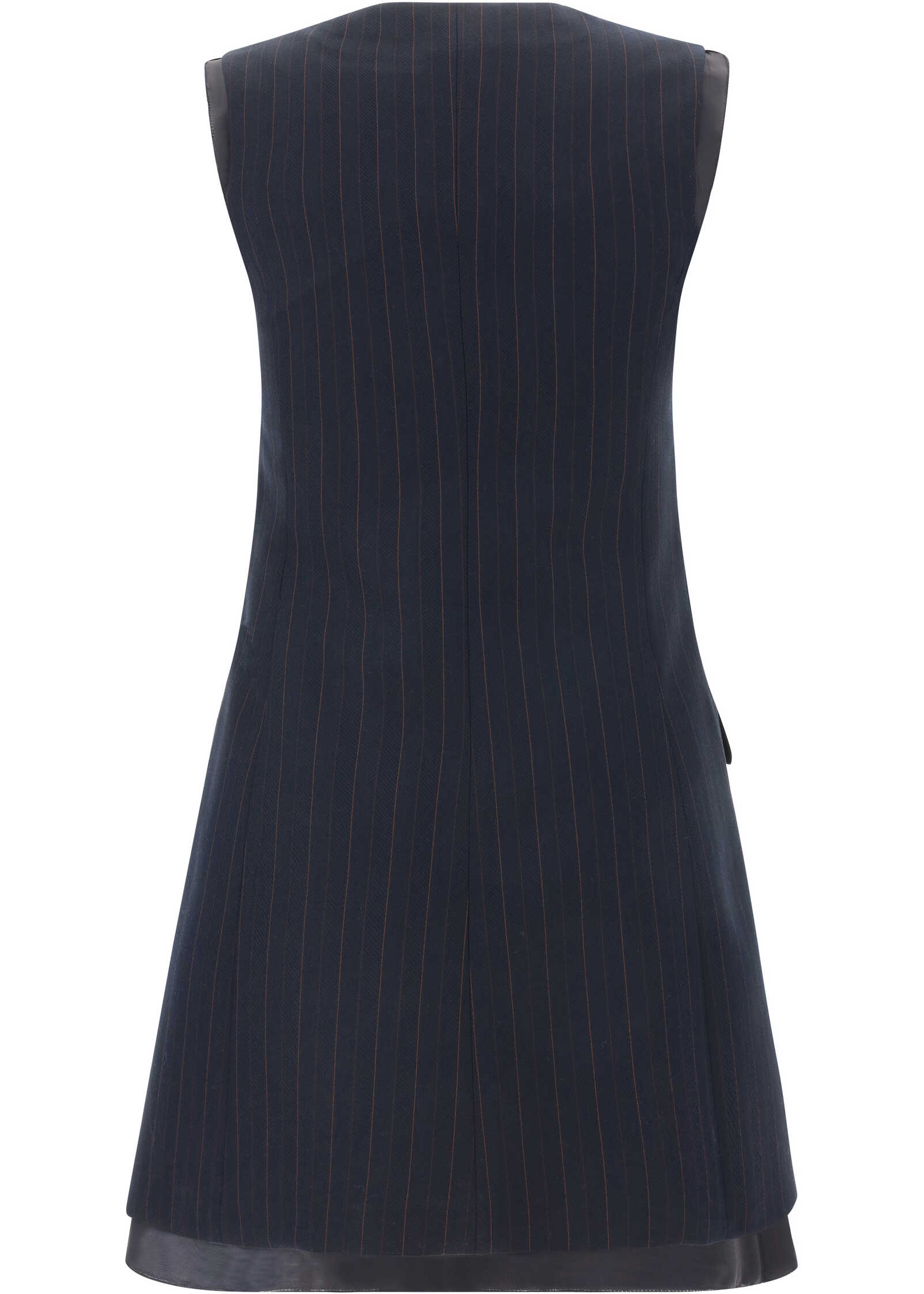 Wool Dress by Miu Miu, pinstripe design, sleeveless pattern, V-neck front, front closure by matching buttons, lower and shoulder hem embellished with slight silk ruffle.